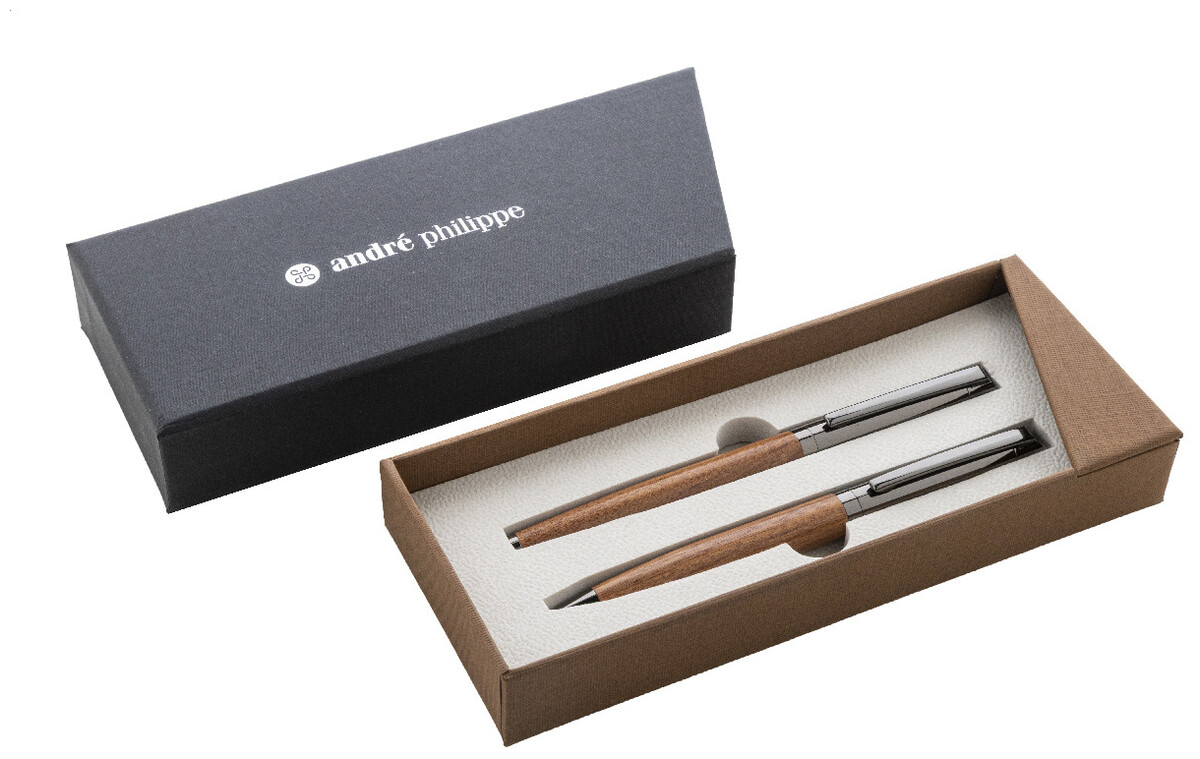 Elegantní sada kovového kuličkového pera a rolleru s dřevěným tělem a lesklými detaily v barvě antracit. Ve dvoubarevné dárkové krabičce s modrou náplní. Produkt značky André Philippe.