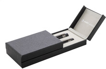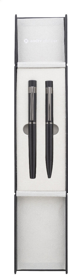 Elegantní sada kovového kuličkového pera a rolleru s lesklými detaily v barvě antracit. V barevně sladěné dárkové krabičce a s modrou náplní. Produkt značky André Philippe.
