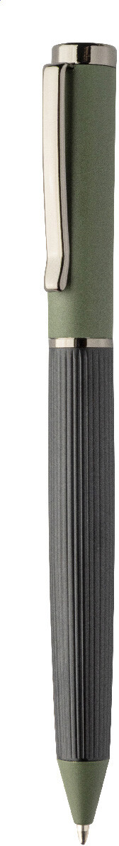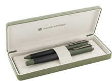 Elegantní sada kovového kuličkového pera a rolleru s pruhovaným tělem, barevnými akcenty a lesklými detaily v barvě antracit. V barevně sladěné dárkové krabičce a s modrou náplní. Produkt značky André Philippe.