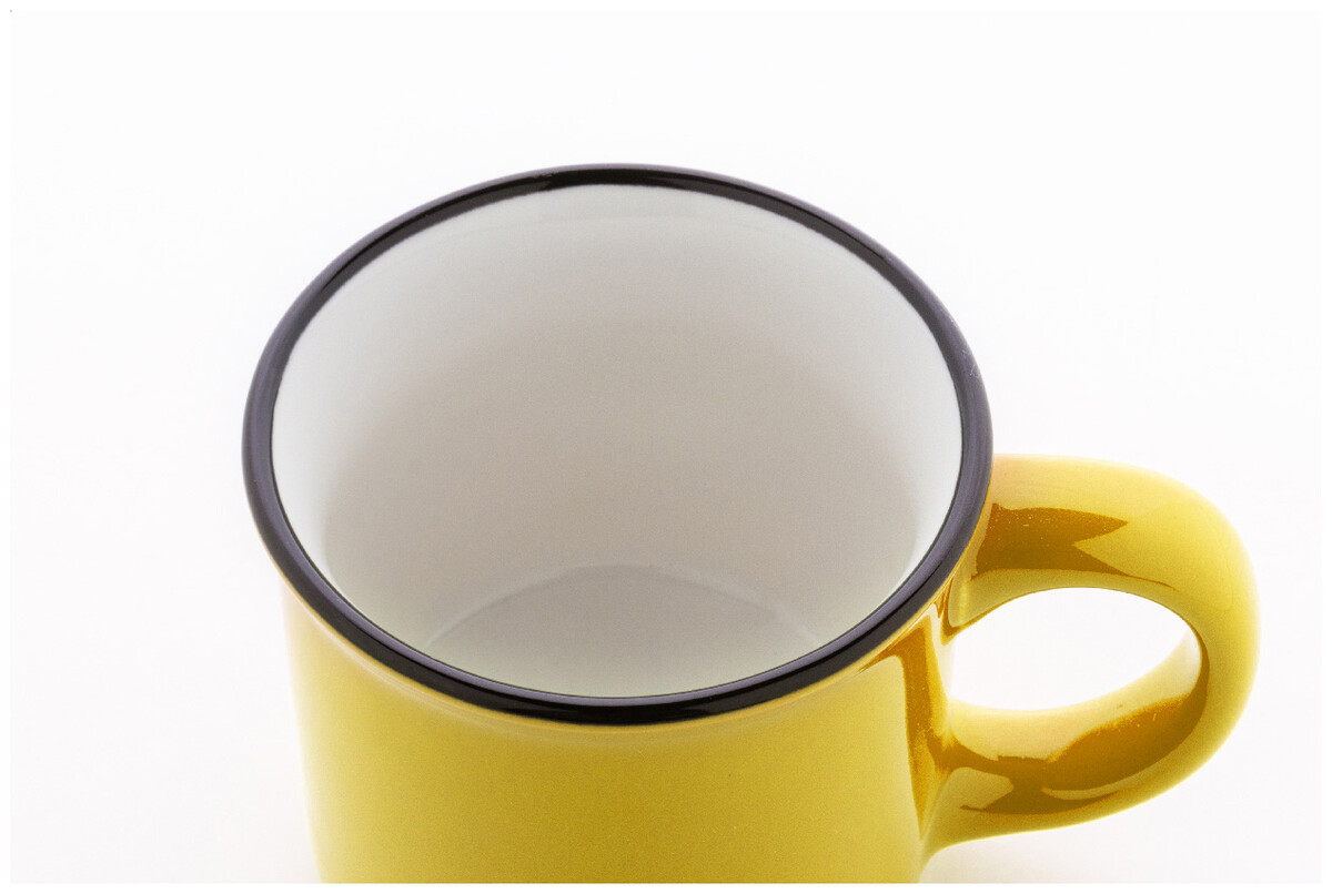 Mini vintage keramický hrnek s černým okrajem, bílým uvnitř a barevným vnějškem, 90 ml. V krabičce z kraftového papíru.