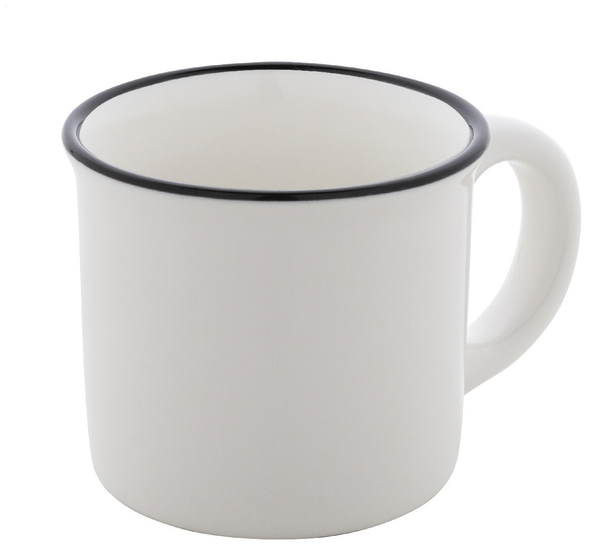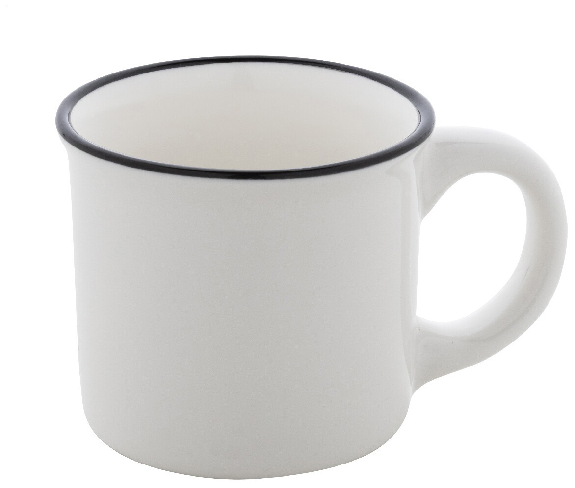 Mini vintage keramický hrnek s černým okrajem, bílým uvnitř a barevným vnějškem, 90 ml. V krabičce z kraftového papíru.