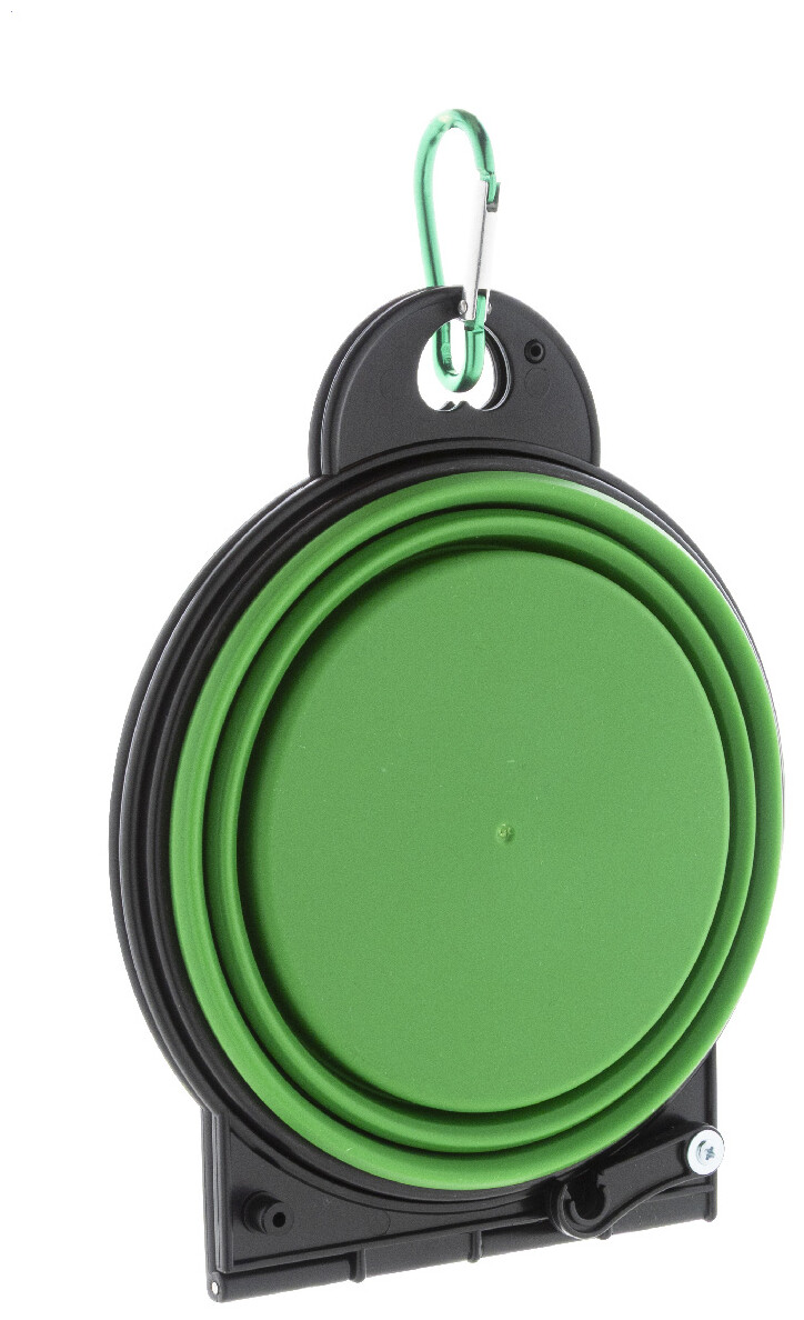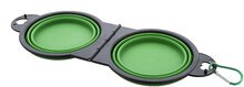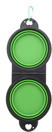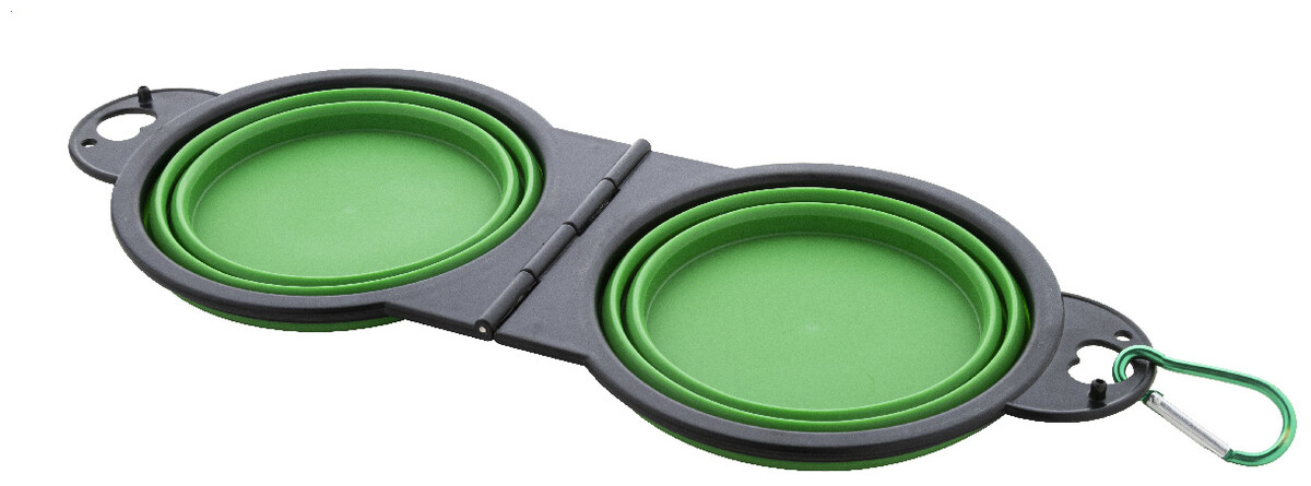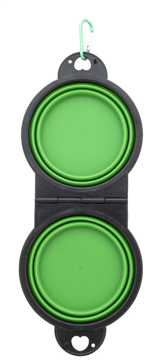 Skládací miska pro domácí mazlíčky z odolného TPE se dvěma přihrádkami o objemu 450 ml a barevně sladěnou hliníkovou karabinou.