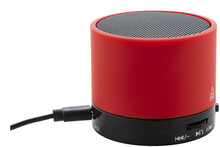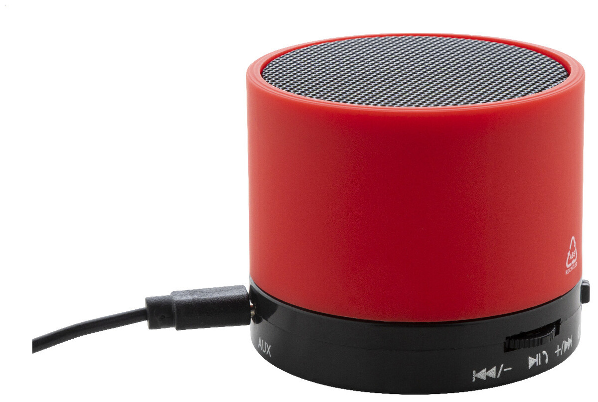 Bezdrátový reproduktor z recyklovaného ABS v pogumovaném pouzdře s kovovou síťovinou a dobíjecí baterií (300 mAh). S funkcí handsfree hovorů a přehrávání MP3 z micro SD karty. Včetně nabíjecího kabelu USB.