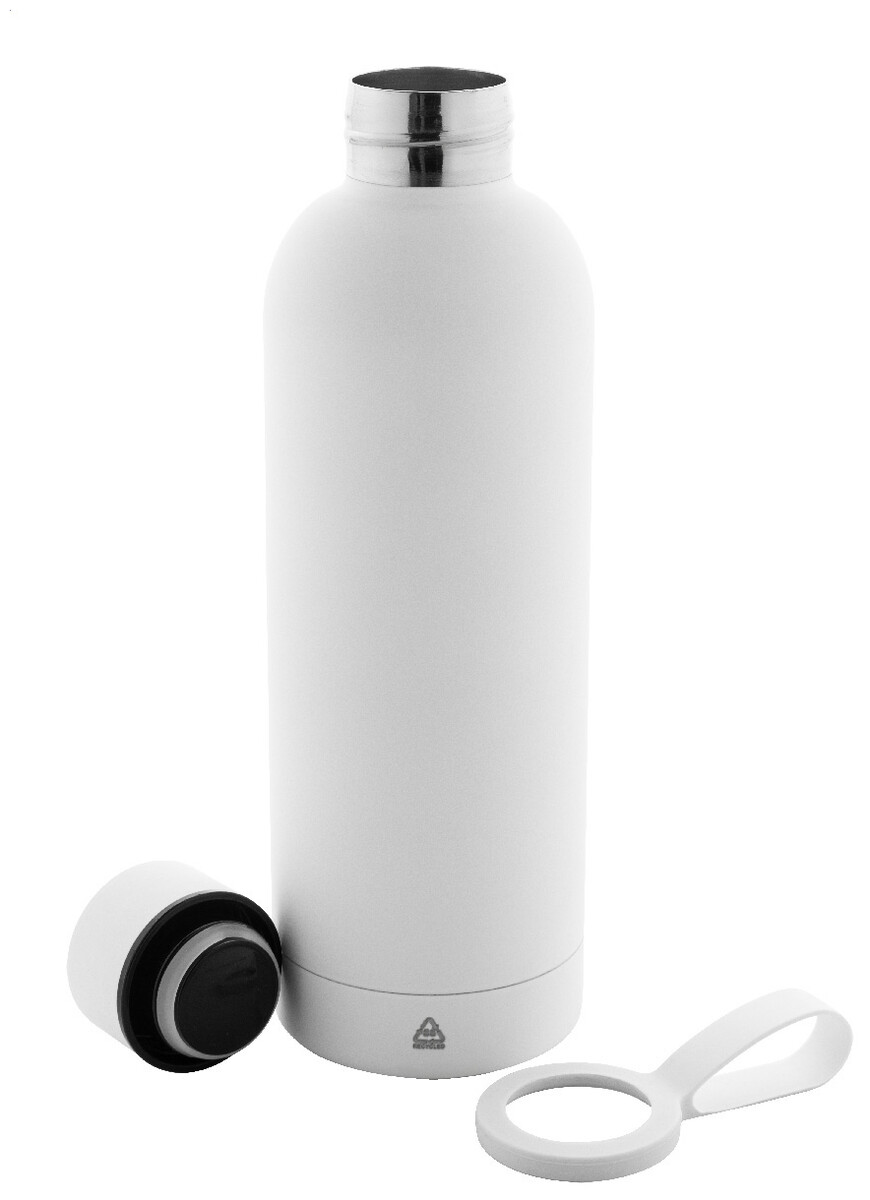 Dvoustěnná vakuová láhev z recyklované nerezové oceli s pogumovanou úpravou a silikonovým páskem, 500 ml.