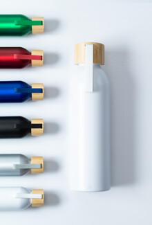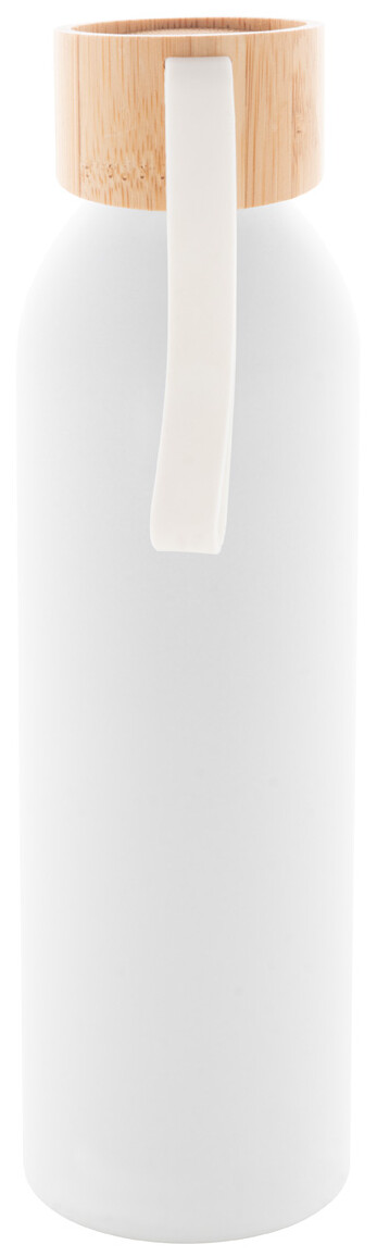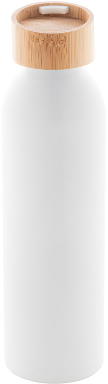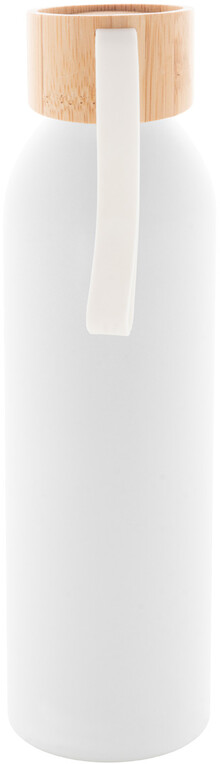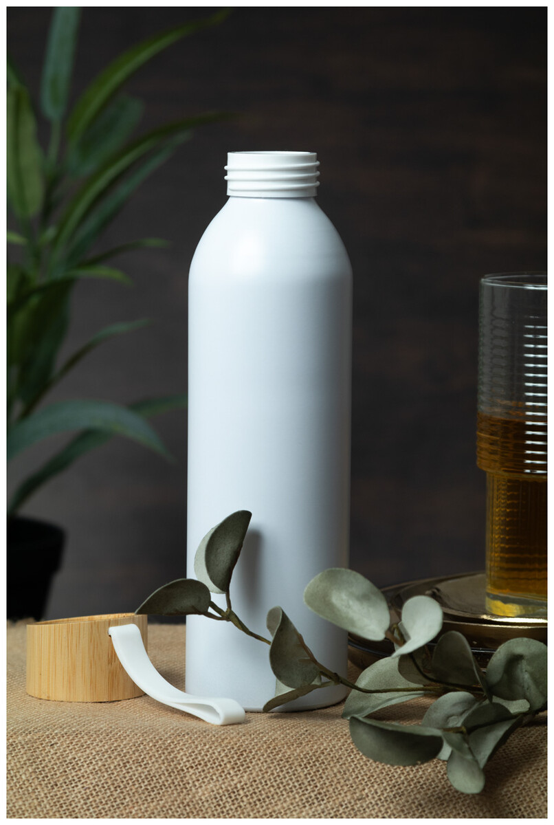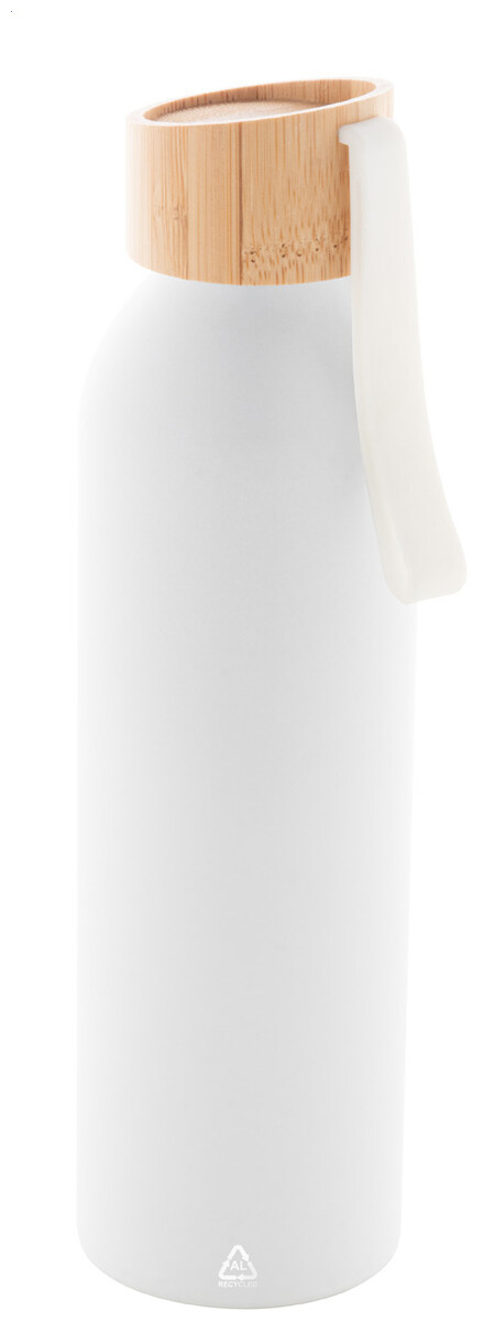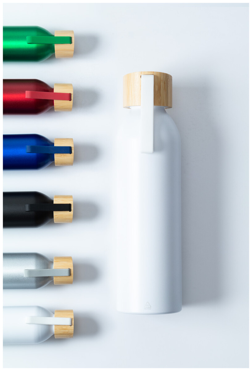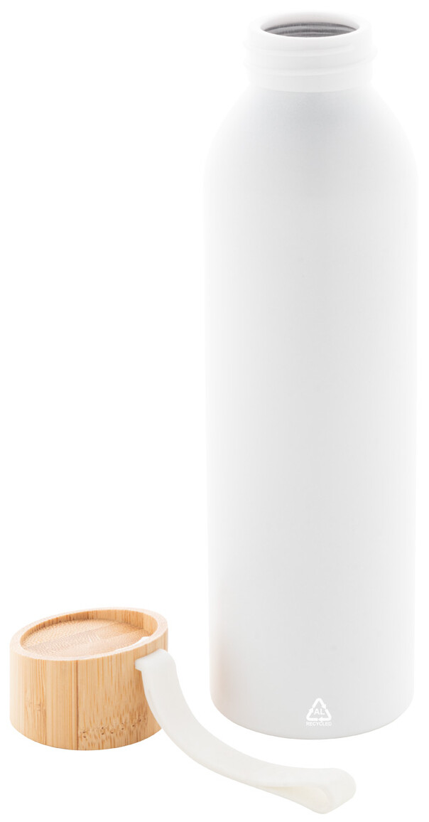 Láhev z recyklovaného hliníku s bambusovým víčkem a silikonovým popruhem v odpovídající barvě, 600 ml.