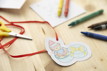 8dílná vánoční omalovánka s papírovými ozdobami, včetně 6 voskovek a závěsných stuh. V červené papírové krabičce.