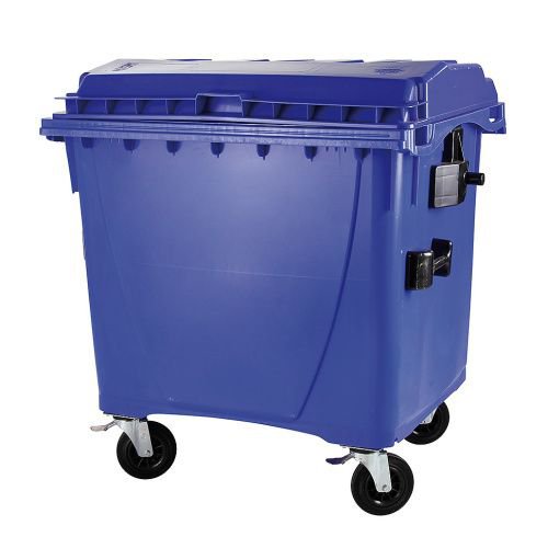 Plastový kontejner o objemu 1100 l s plochým víkem. Vybaveno 4x kolečkem, z toho 2x bržděné s průměrem 200 mm. Výrobek je v souladu s EN 840. Odolné vůči UV záření, chemickým a biologickým vlivům nebo mrazu. Hladké plochy zabraňují ulpívání odpadu. Výrobní materiál neobsahuje kadmium a může být znovu granulován.