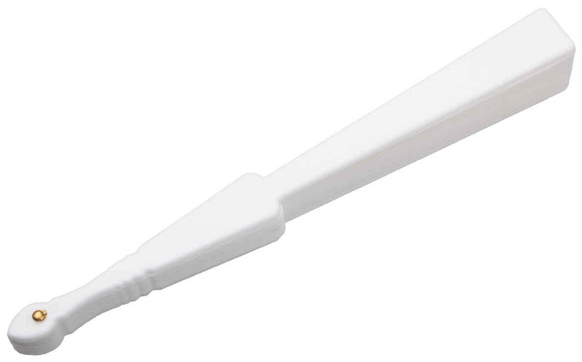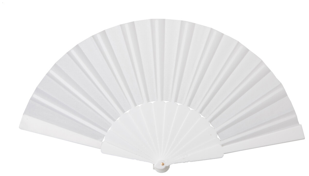 Látkový vějíř s plastovou rukojetí.