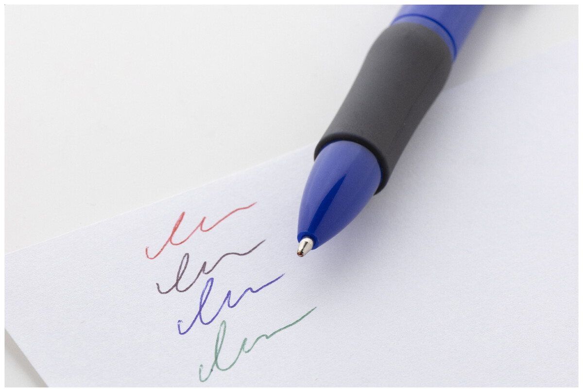 Vícebarevné kuličkové pero z recyklovaného ABS materiálu s gumovým úchopem. S černou, modrou, červenou a zelenou náplní.