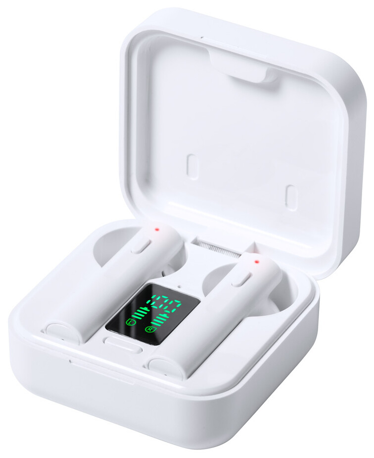 Skutečná bezdrátová stereofonní sluchátka (TWS) s funkcí hands-free volání v plastovém nabíjecím pouzdře se solární nabíječkou. Včetně nabíjecího kabelu USB.