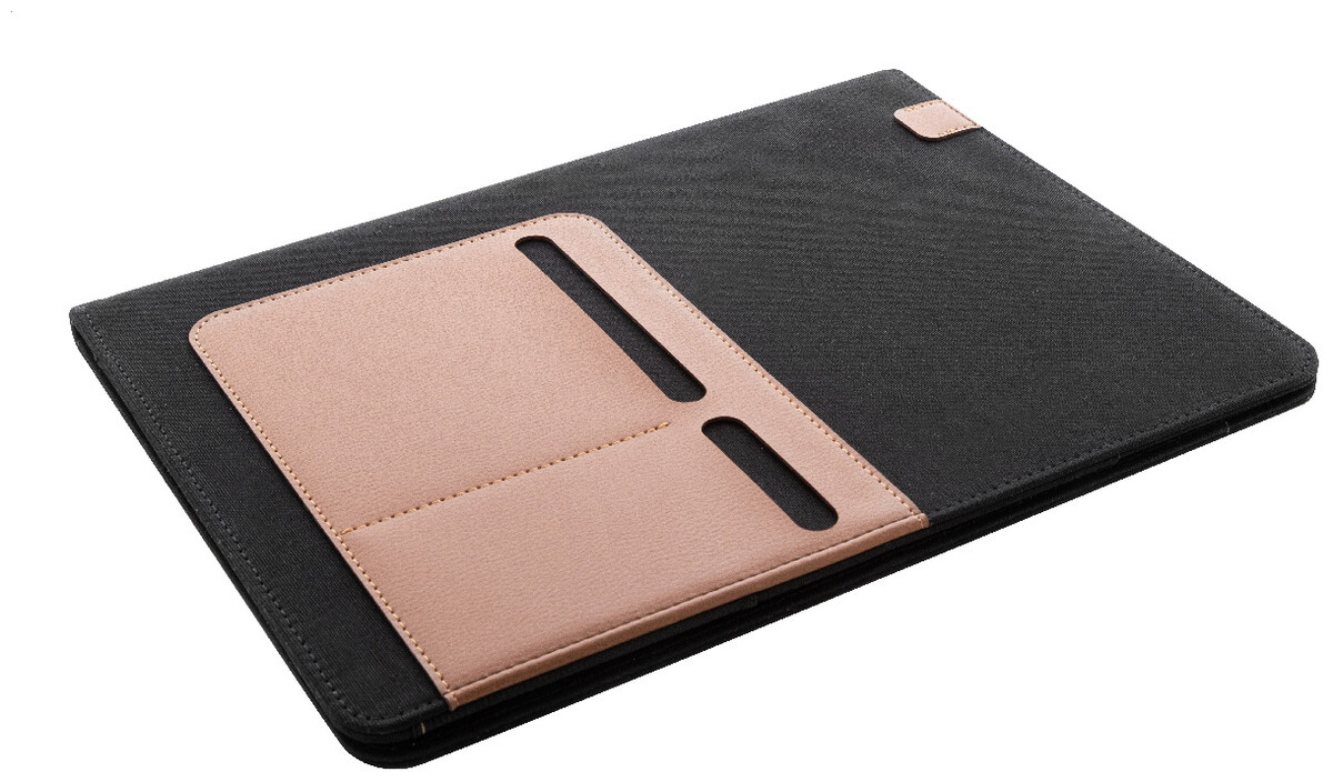 Složka na dokumenty A4 z recyklovaného plátna a recyklované umělé kůže s několika předními a vnitřními kapsami. S blokem na 20 linkovaných listů z recyklovaného papíru. 70 % recyklované bavlny a 30 % RPET polyesteru.