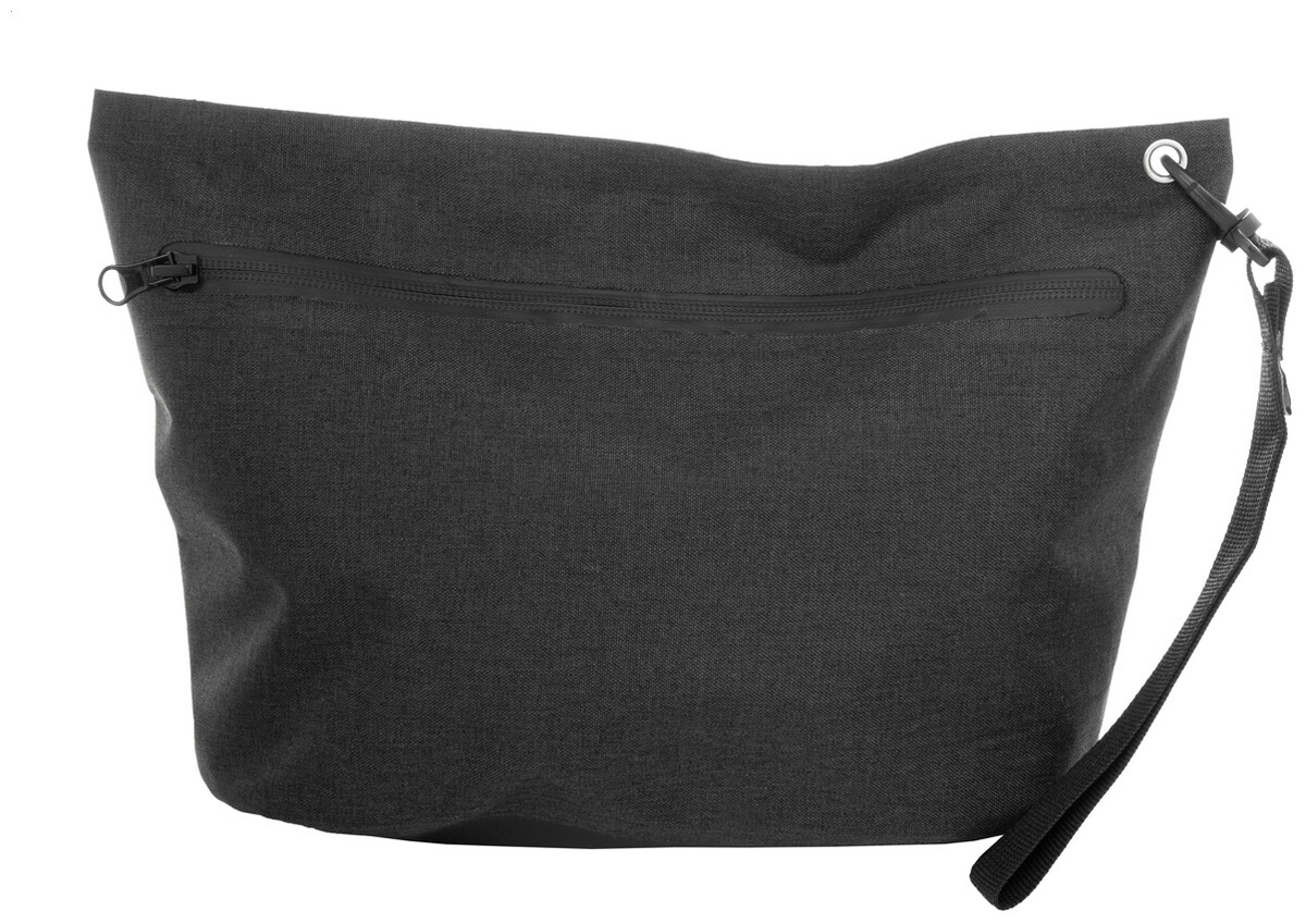 Vodotěsná kosmetická taštička na zip z 300D RPET polyesteru s karabinou na zápěstí. S výrazným štítkem RPET.