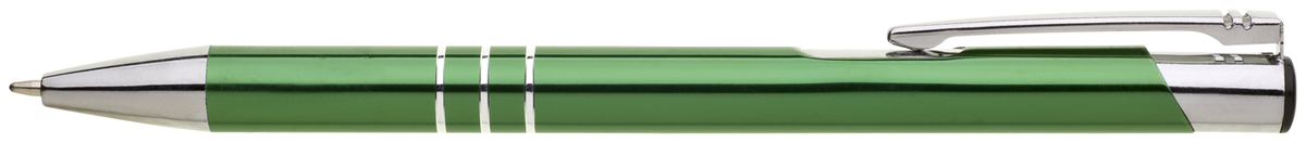 TRIALI hliníková reklamní tužka. Lesklé zelené tělo se třemi stříbrnými proužky a chromovými doplňky.
