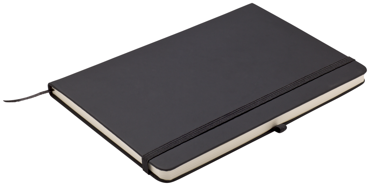 Zápisník A5 v černých deskách z PU materiálu má 80 linkovaných listů. Blok má uzavírací gumičku, poutko na propisku a textilní záložku v barvě desek.