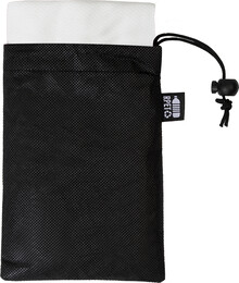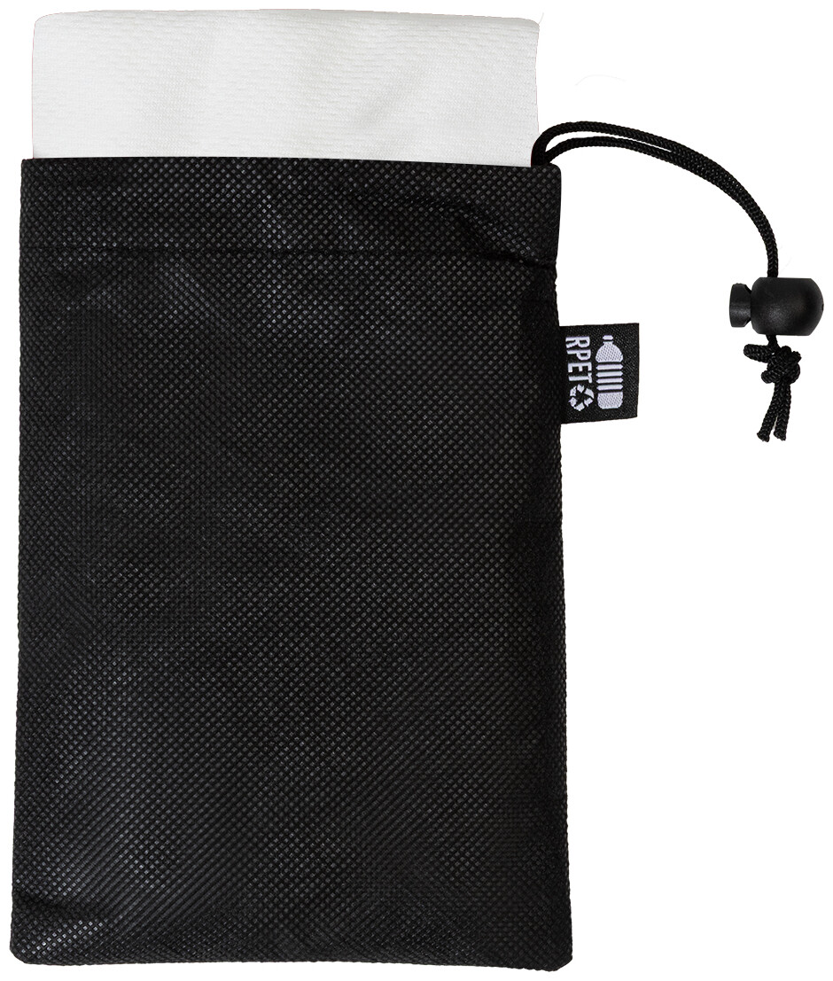 Sportovní ručník z mikrovlákna RPET v přepravním pouzdře z netkané tkaniny RPET s charakteristickou etiketou RPET. Polyester RPET, 140 g/m2.