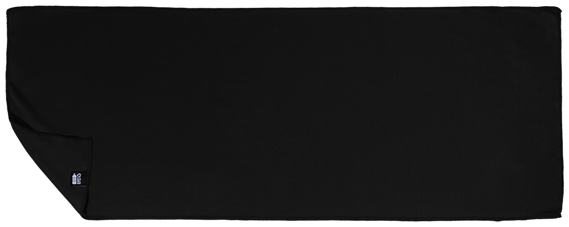 Sportovní ručník z mikrovlákna RPET v přepravním pouzdře z netkané tkaniny RPET s charakteristickou etiketou RPET. Polyester RPET, 140 g/m2.