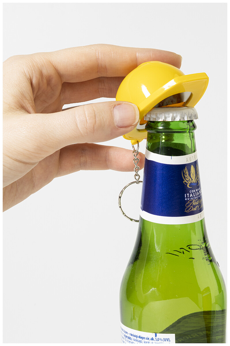 Přívěsek na klíče ve tvaru bezpečnostní přilby z recyklovaného ABS materiálu s otvírákem na lahve.