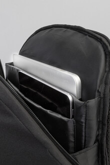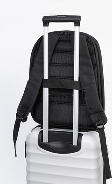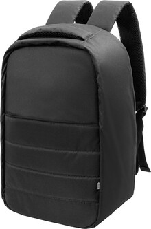 Batoh z RPET s ochranou proti krádeži s přihrádkou na zip, polstrovanou přihrádkou na notebook (15") a tablet (12"), popruhem na kufr, polstrovanými zády a ramenními popruhy. Se skrytou kapsou proti krádeži. Polyester 300D RPET. S výrazným štítkem RPET.