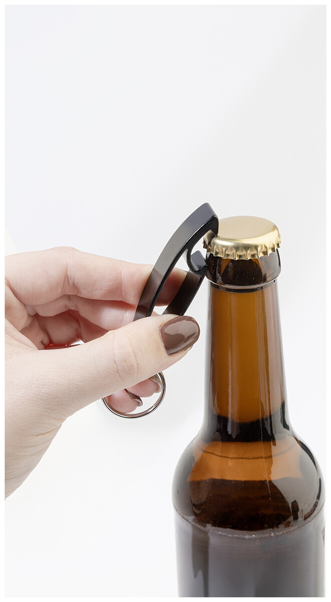 Otvírák na lahve z recyklovaného hliníku s kovovým kroužkem na klíče.