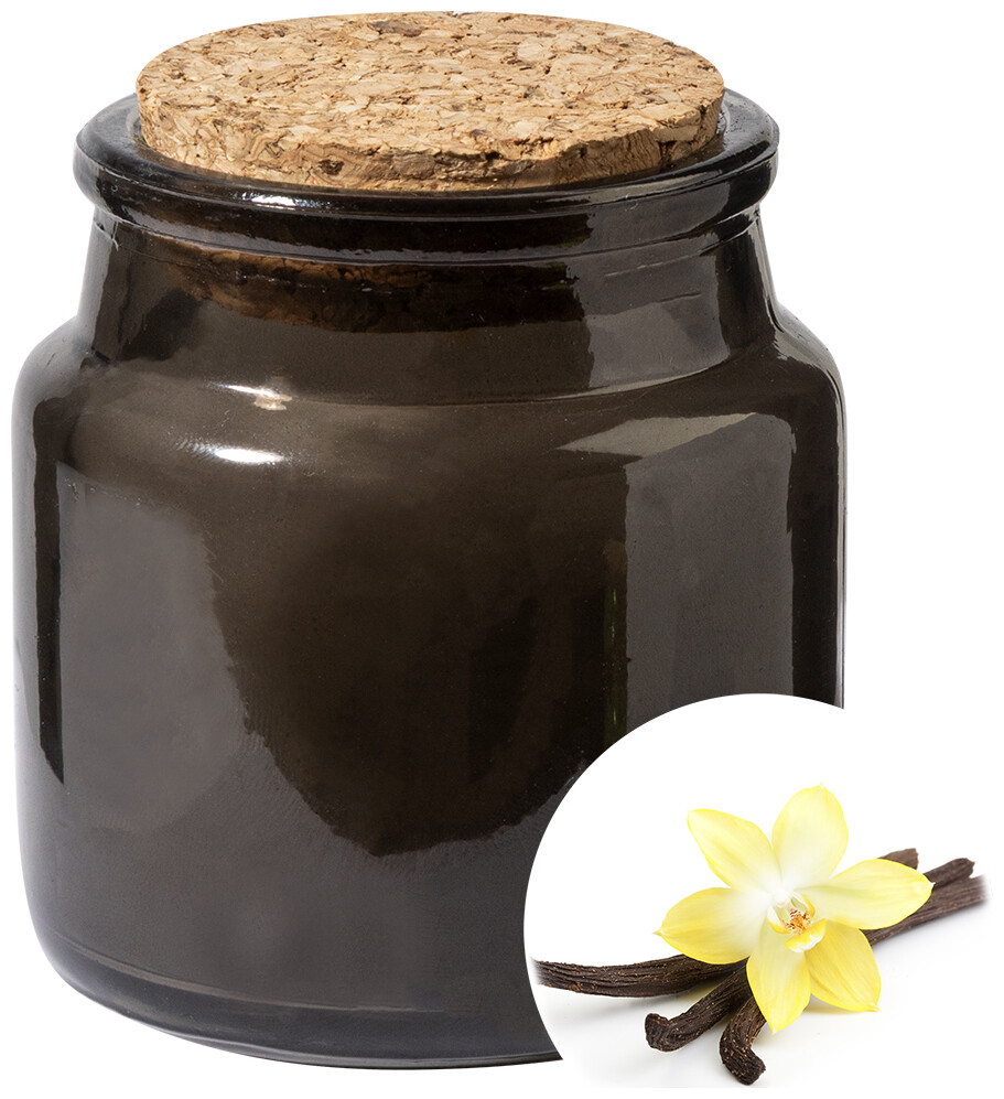 Vosková svíčka z rostlinného vosku s vůní vanilky ve skleněném svícnu s víčkem z přírodního korku. S 80 gramy vosku. Doba hoření: 16 hodin. V krabičce z kraftového papíru.