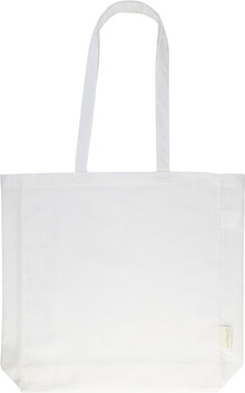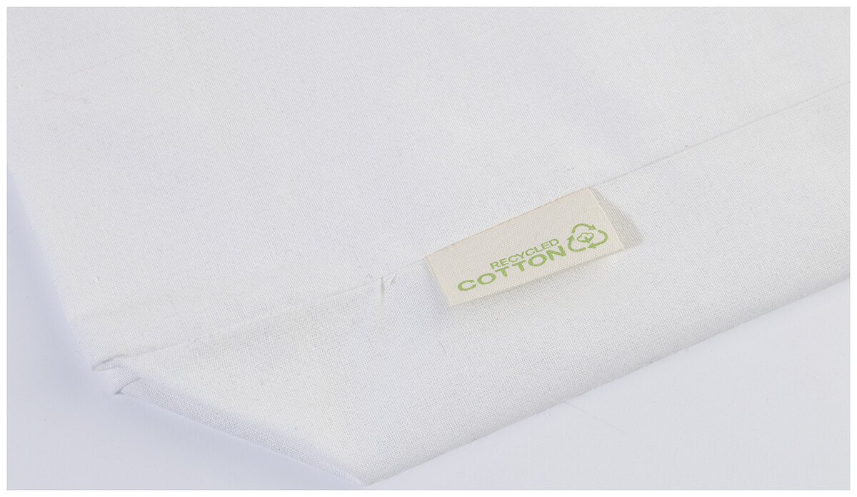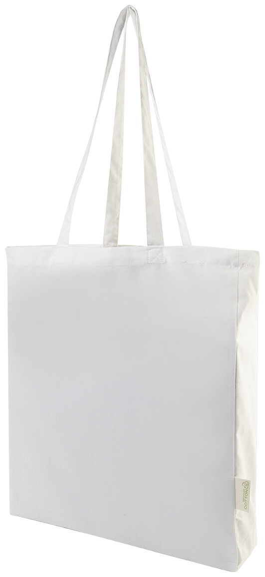 Nákupní taška s klínkem a dlouhými uchy ze 70 % recyklované bavlny a 30 % RPET polyesteru, 140 g/m2. S výraznou etiketou o recyklované bavlně.