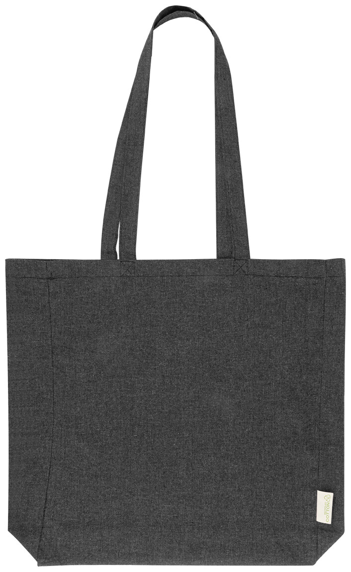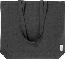 Nákupní taška s klínkem a dlouhými uchy ze 70 % recyklované bavlny a 30 % RPET polyesteru, 140 g/m2. S výraznou etiketou o recyklované bavlně.