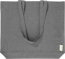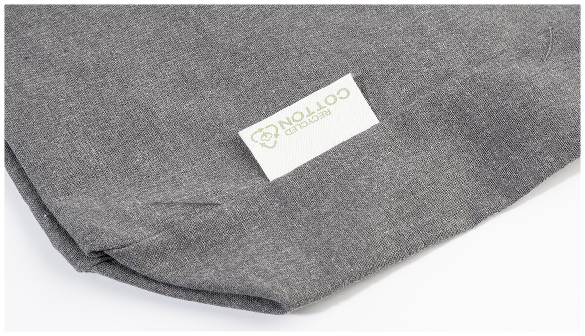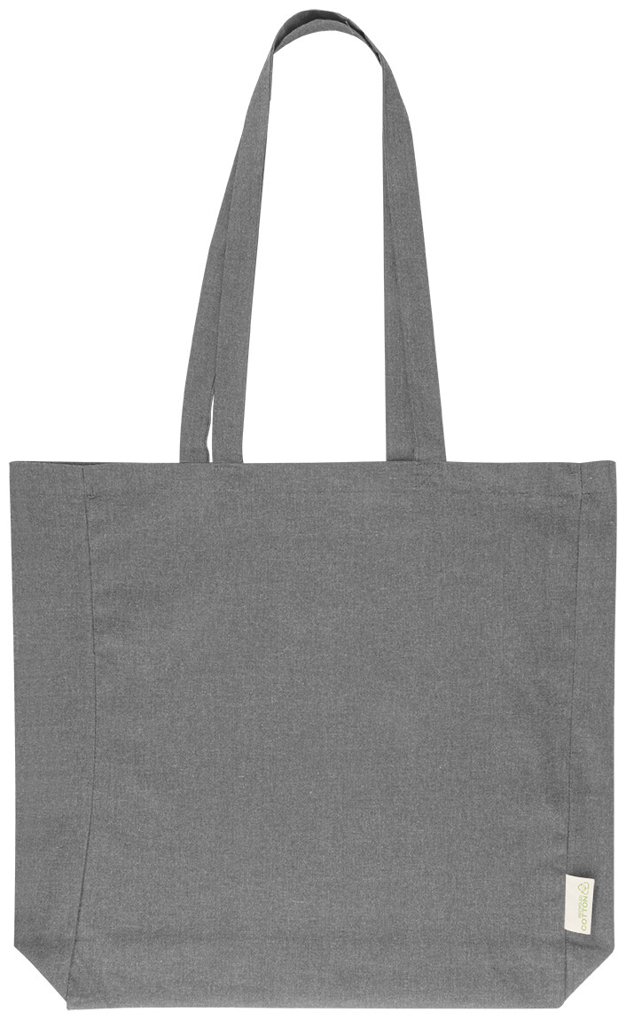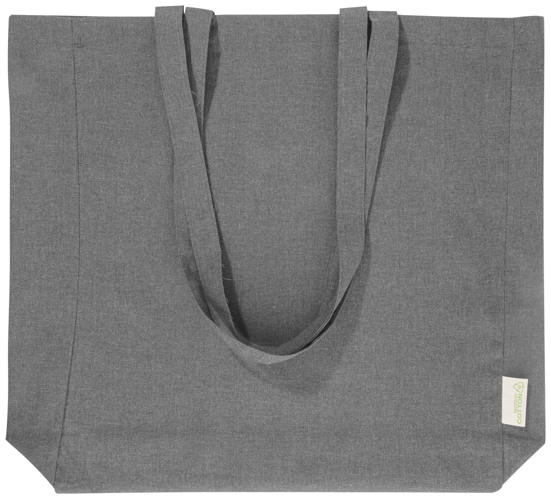 Nákupní taška s klínkem a dlouhými uchy ze 70 % recyklované bavlny a 30 % RPET polyesteru, 140 g/m2. S výraznou etiketou o recyklované bavlně.