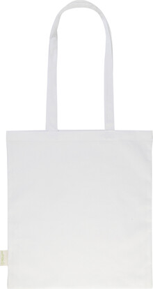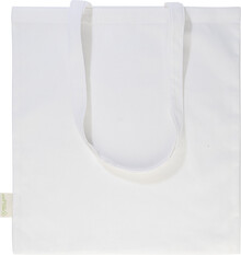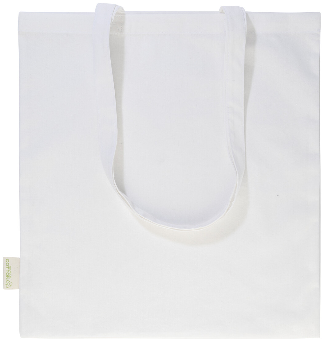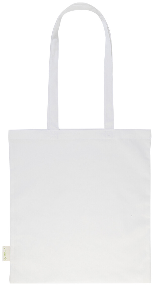 Nákupní taška s dlouhými uchy ze 70 % recyklované bavlny a 30 % RPET polyesteru, 140 g/m2. S výraznou etiketou o recyklované bavlně.