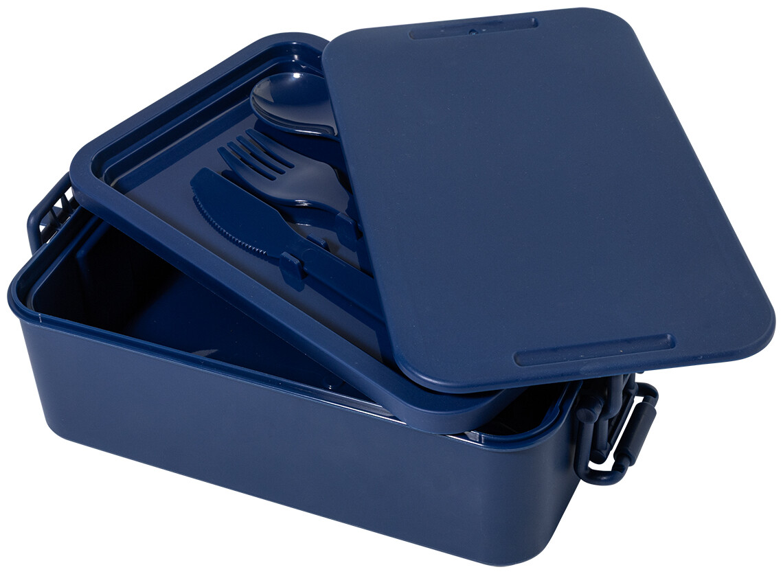 Box na jídlo z PP plastu se sadou příborů (vidlička, lžíce a nůž), zapínáním na přezku a 2 přihrádkami (1000 ml a 800 ml). Stohovatelný design pro kompaktní skladování.