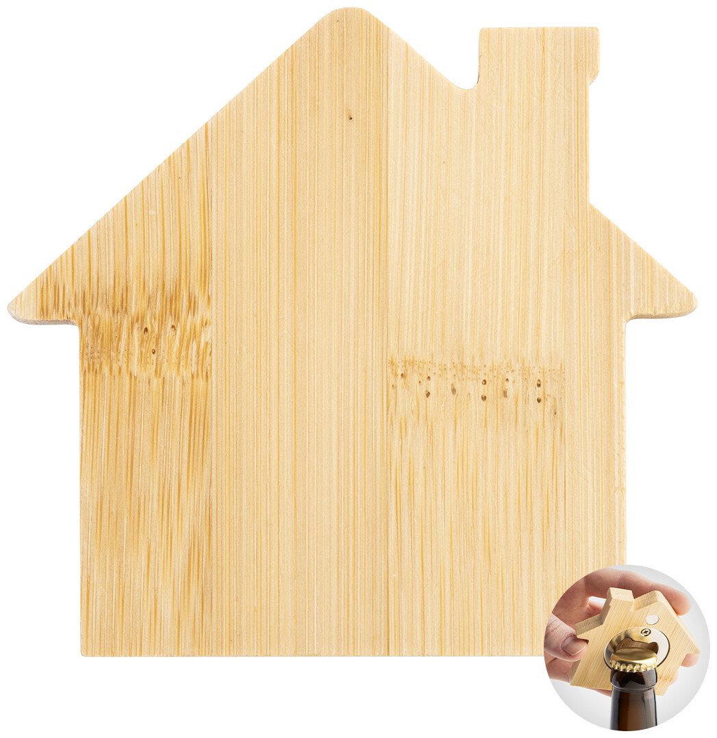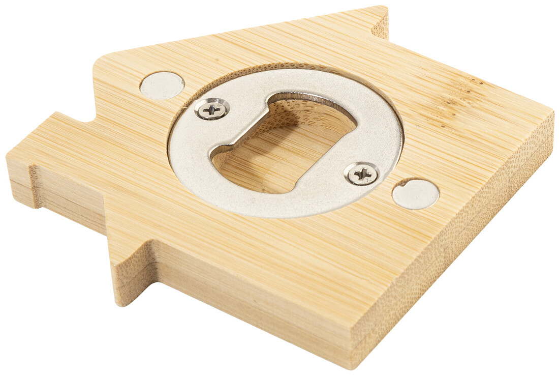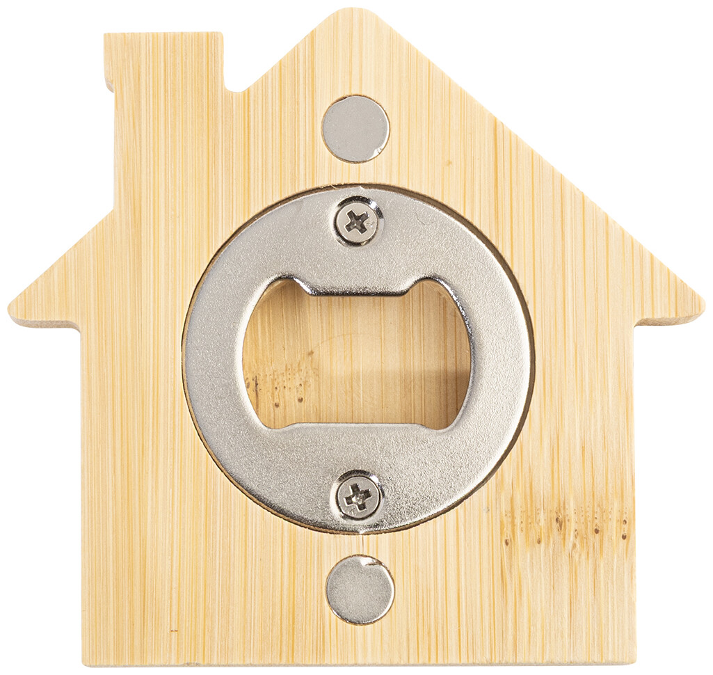 Bambusový magnet na ledničku ve tvaru domečku s otvírákem na lahve.