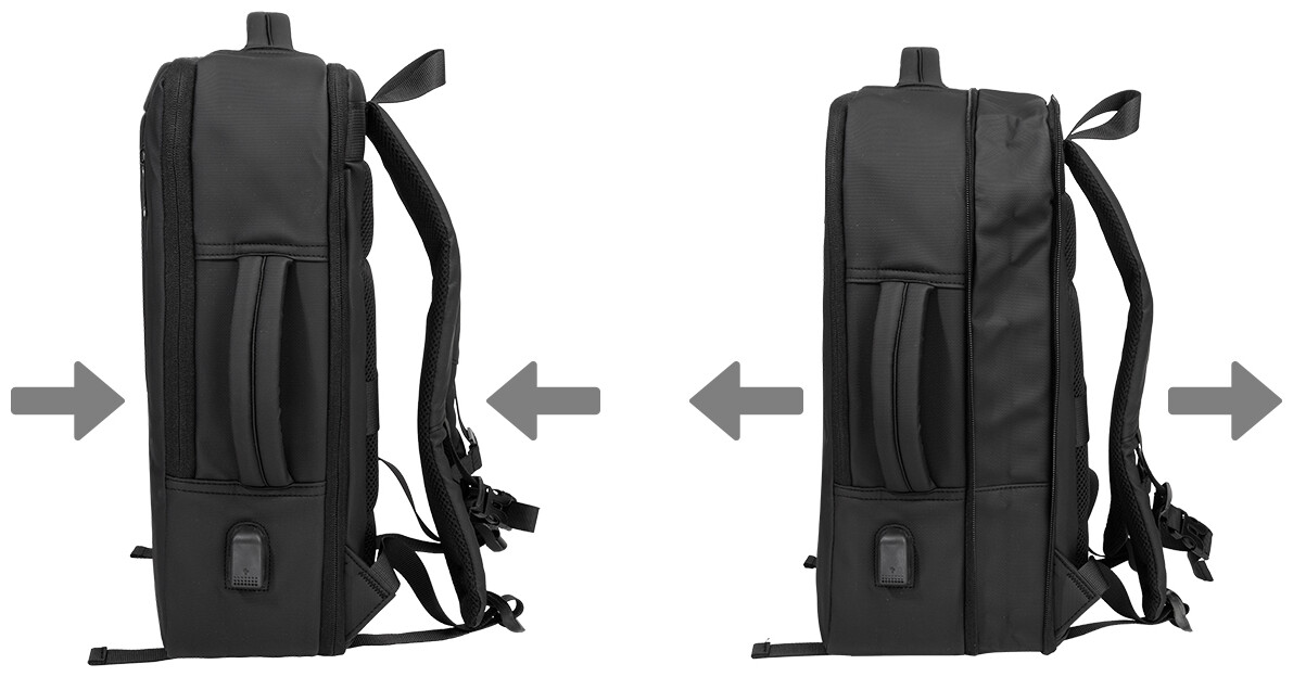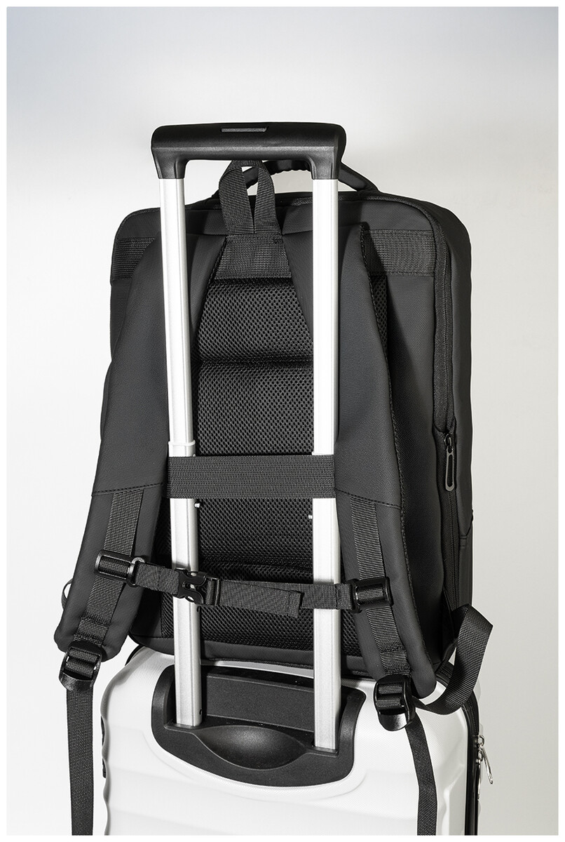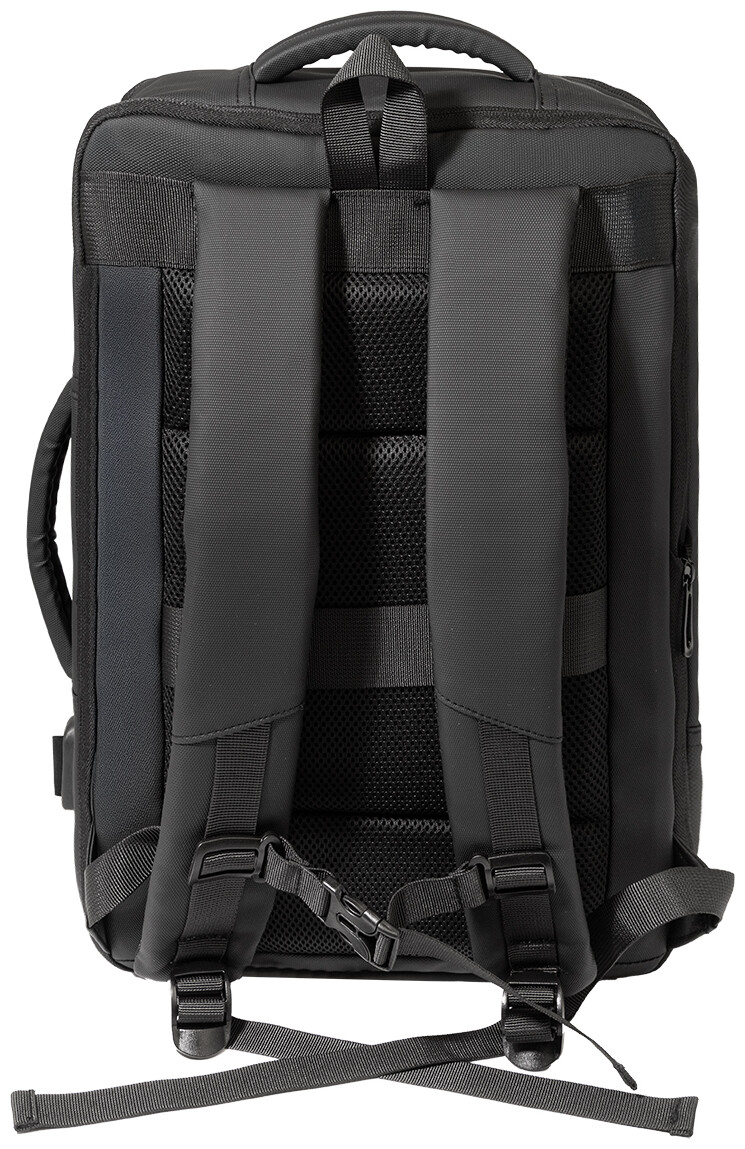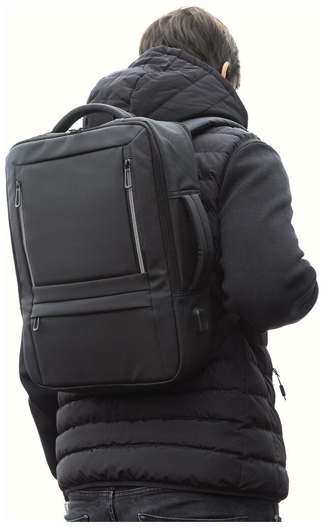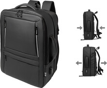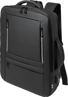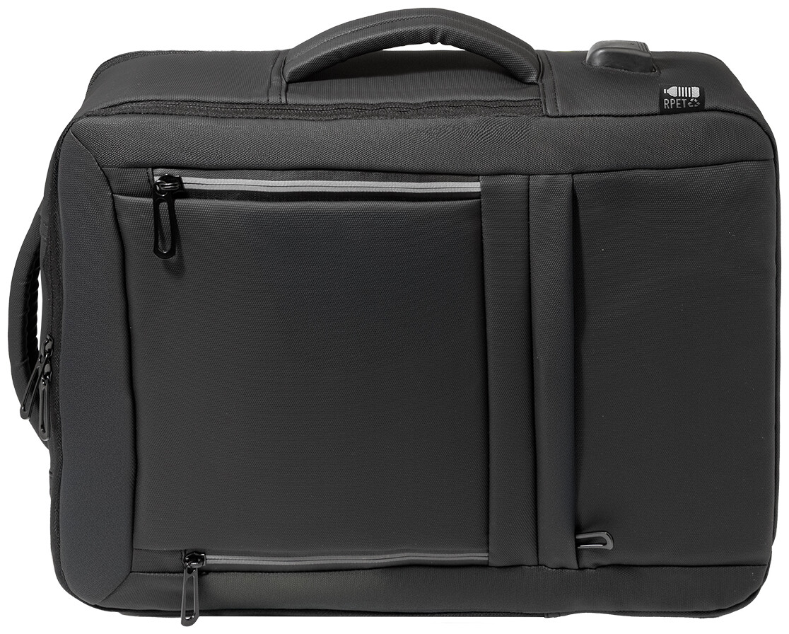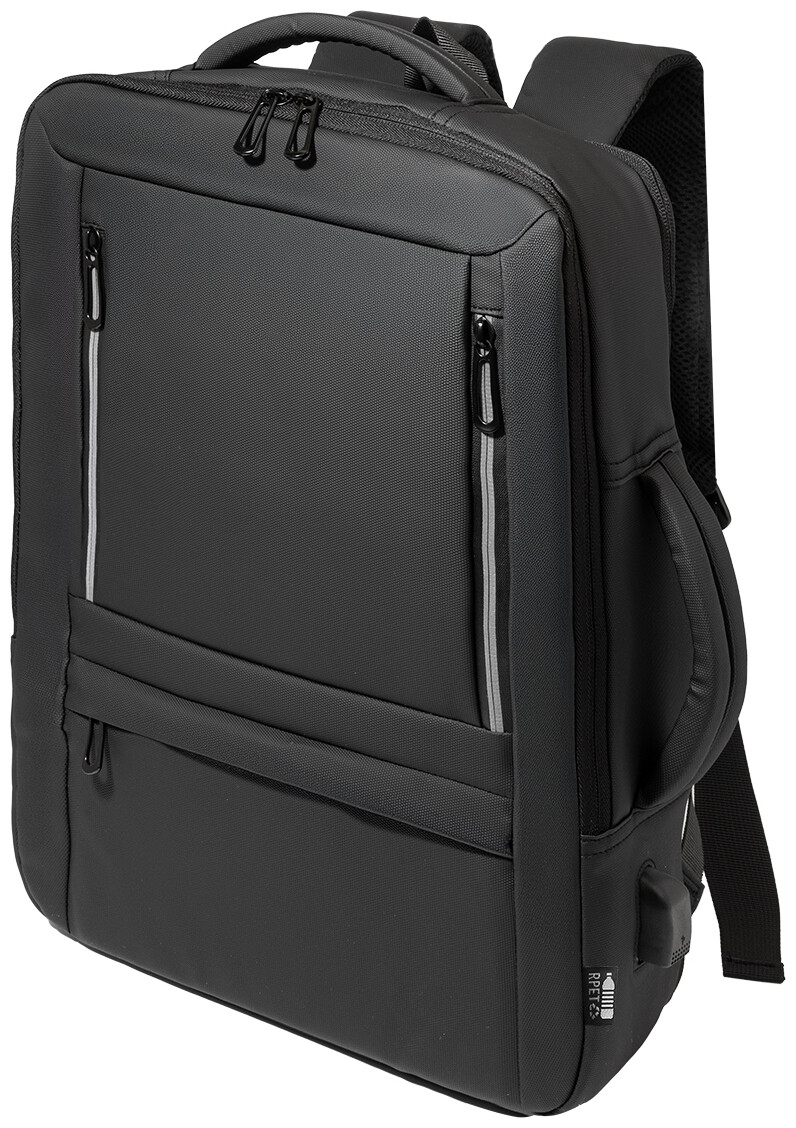 Voděodolný batoh a taška na dokumenty z RPET s možností prodloužení a hlavní přihrádkou na zip, předními kapsami s reflexními zipy, polstrovanou přihrádkou na notebook (15") a tablet (12") a vestavěným USB portem pro power banky. S popruhem na kufry, polstrovanými zády a ramenními popruhy s hrudním popruhem. Polyester 600D RPET s PU zátěrem a výrazným štítkem RPET.