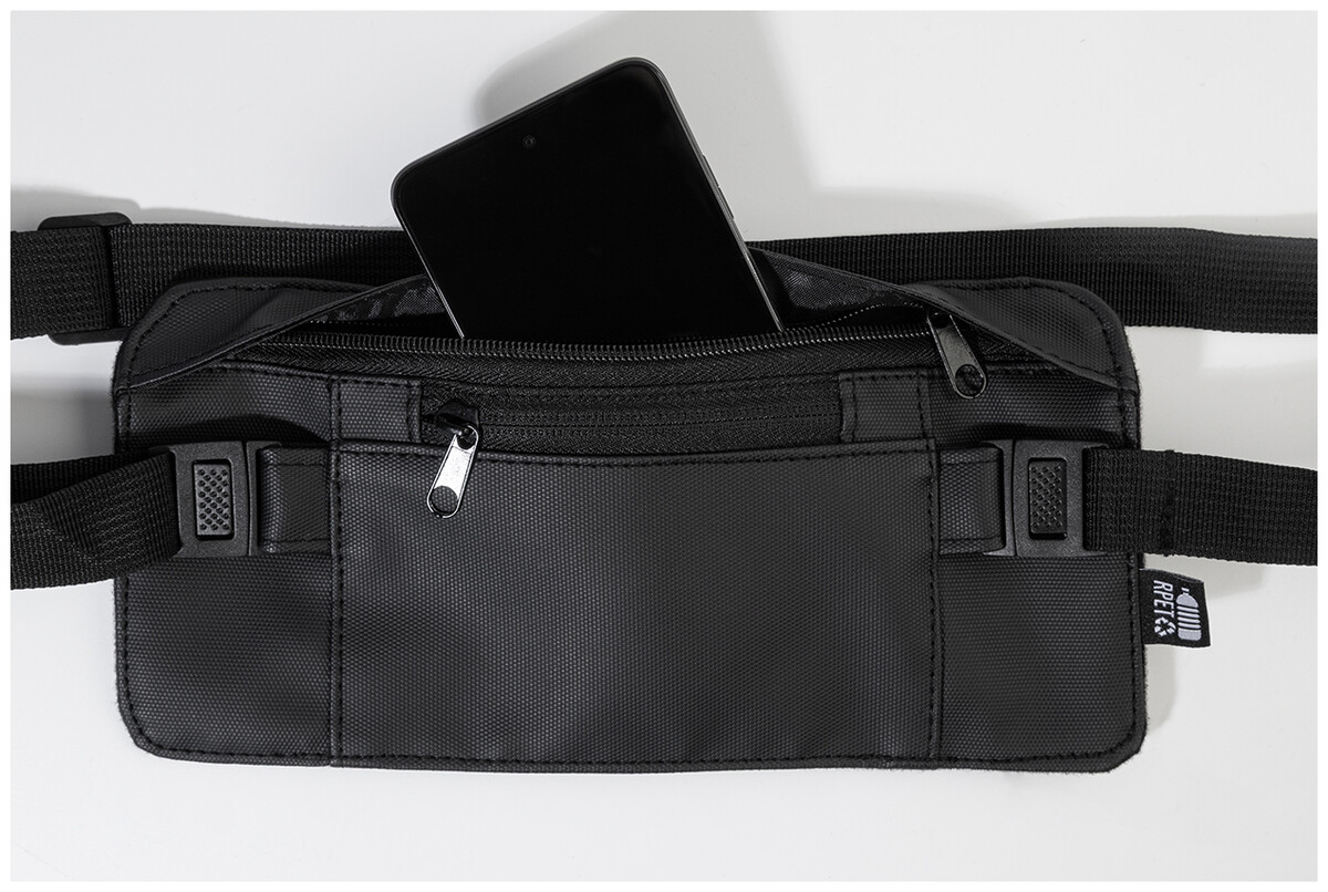 Úzká ledvinka z RPET s přední stranou potaženou PU, přihrádkou na zip a přední kapsou a nastavitelným popruhem. Polyester 600D RPET s PU zátěrem a výrazným štítkem RPET.