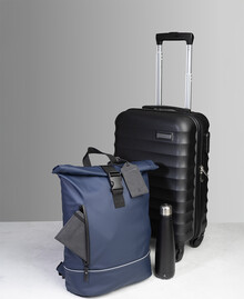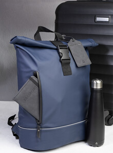 Voděodolný batoh s rolovacím vrškem z měkké recyklované PU kůže s hlavní přihrádkou na zip a zapínáním na přezku, přední kapsou s voděodolným zipem, polstrovanou přihrádkou na notebook (15") a reflexním proužkem. S polstrovanými zády a ramenními popruhy. S výraznou nálepkou z recyklované PU kůže.