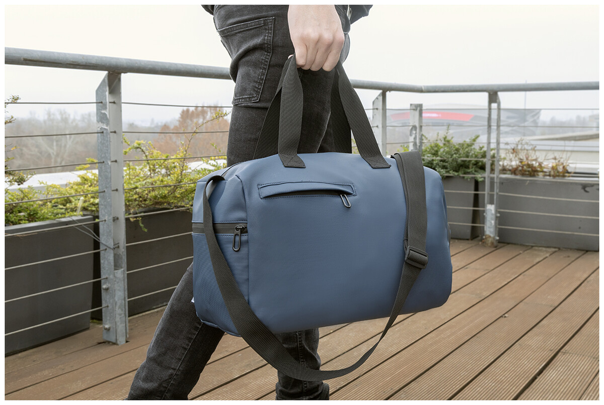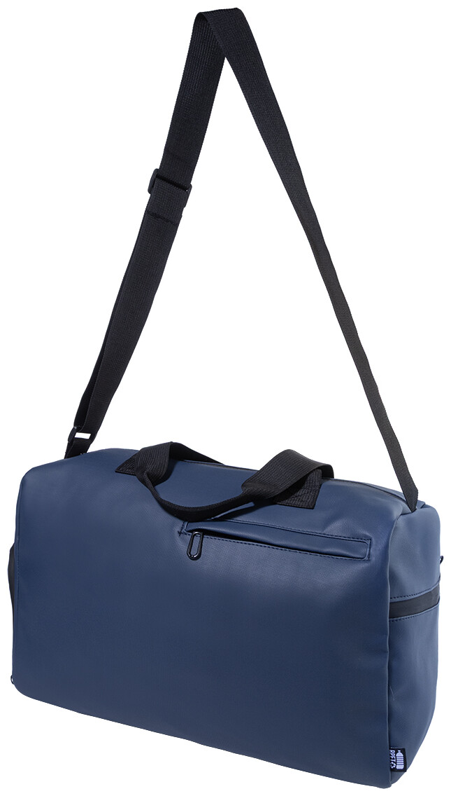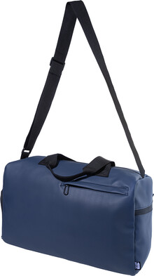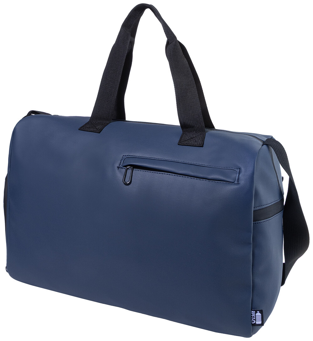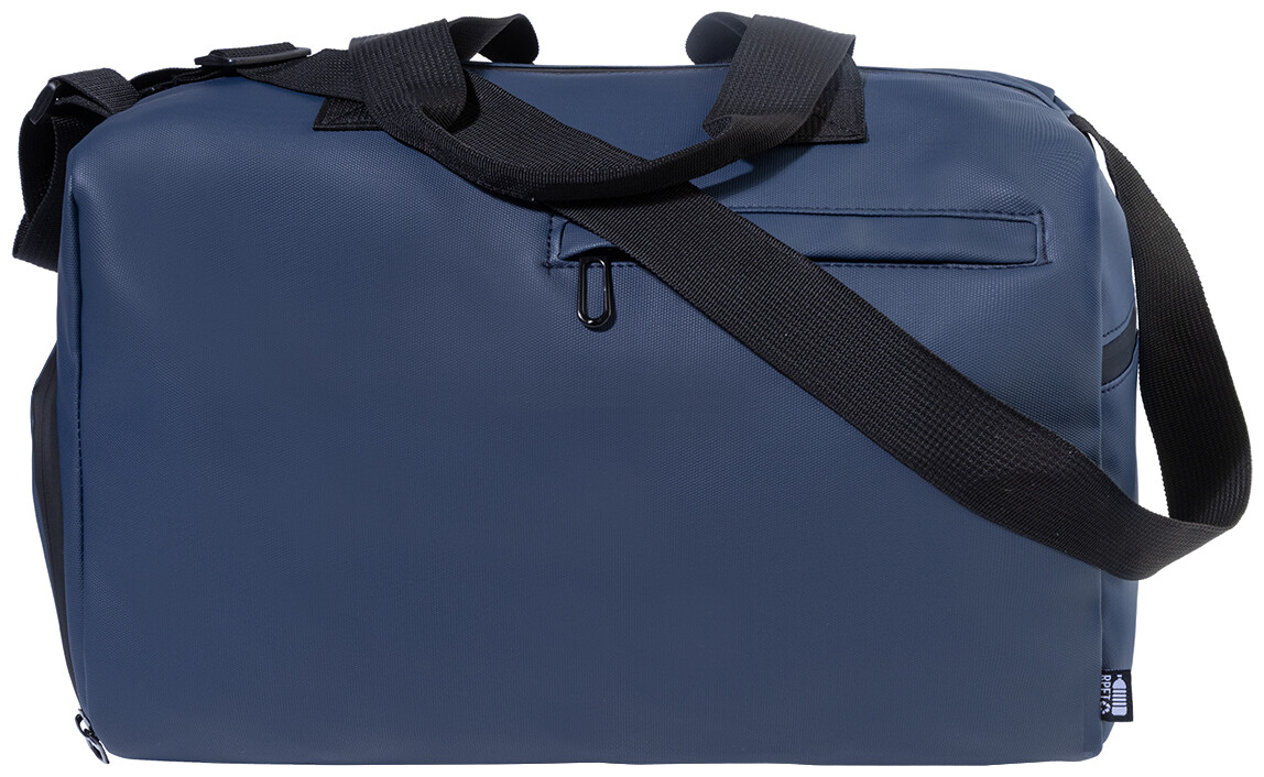 Voděodolná sportovní taška z RPET s hlavní přihrádkou na zip, přední kapsou na zip, přihrádkou na boty na zip a nastavitelným ramenním popruhem. Polyester 600D RPET s PU zátěrem a výrazným štítkem RPET.