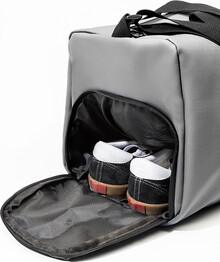 Voděodolná sportovní taška z RPET s hlavní přihrádkou na zip, přední kapsou na zip, přihrádkou na boty na zip a nastavitelným ramenním popruhem. Polyester 600D RPET s PU zátěrem a výrazným štítkem RPET.