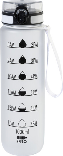 Sportovní láhev z matného RPET s motivačním objemovým a časovým značením, s automaticky otevíratelným odklápěcím víčkem s bezpečnostním zámkem a poutkem na nošení. 1000 ml. Bez BPA. Nevhodné pro sycené nápoje.