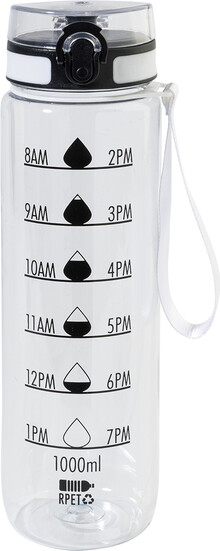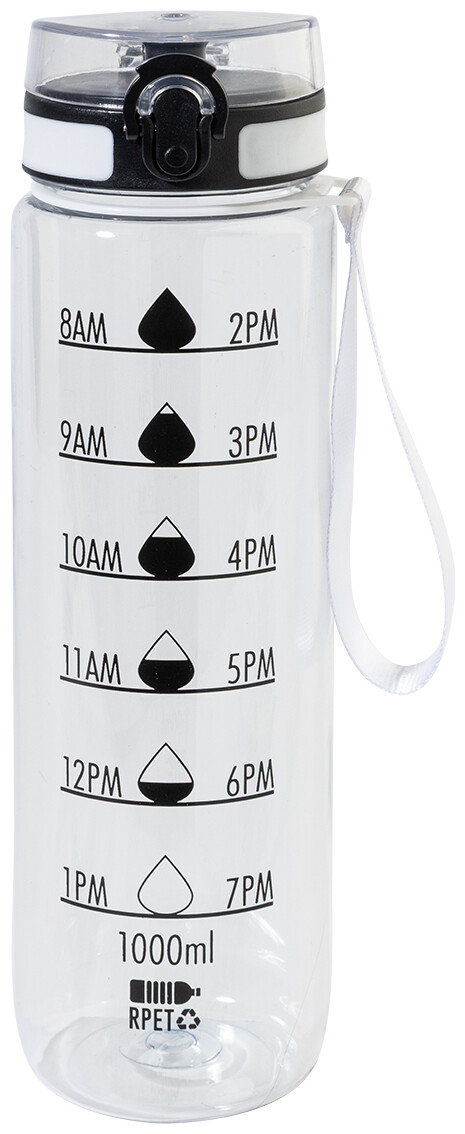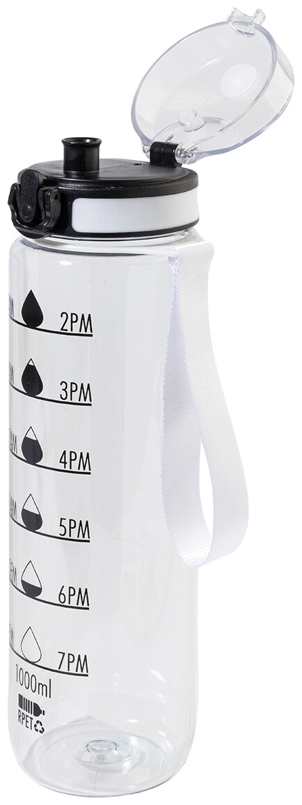Sportovní láhev z matného RPET s motivačním objemovým a časovým značením, s automaticky otevíratelným odklápěcím víčkem s bezpečnostním zámkem a poutkem na nošení. 1000 ml. Bez BPA. Nevhodné pro sycené nápoje.