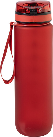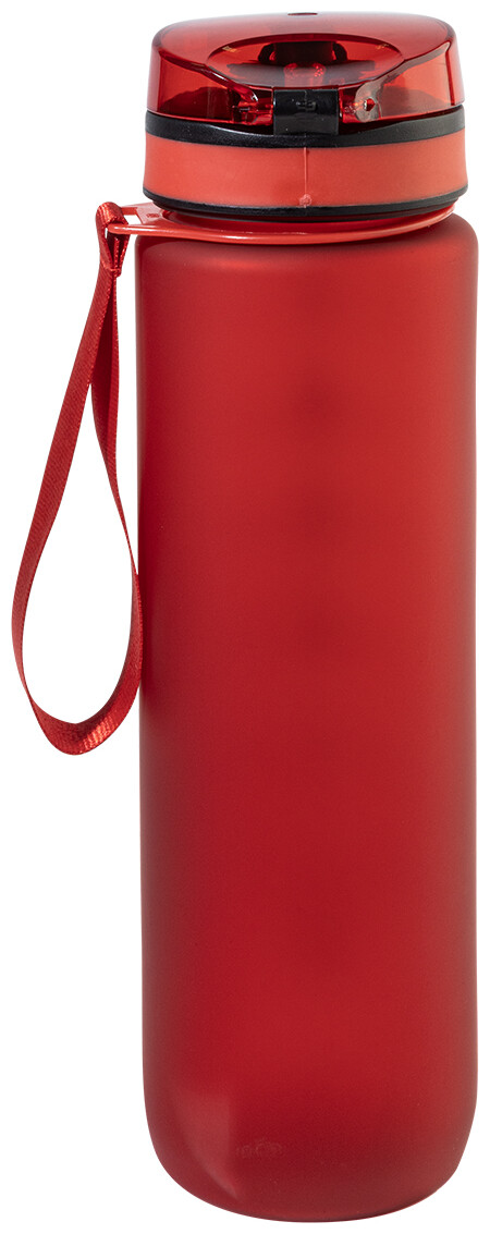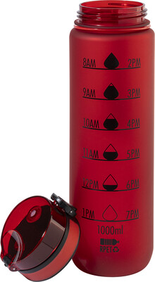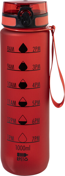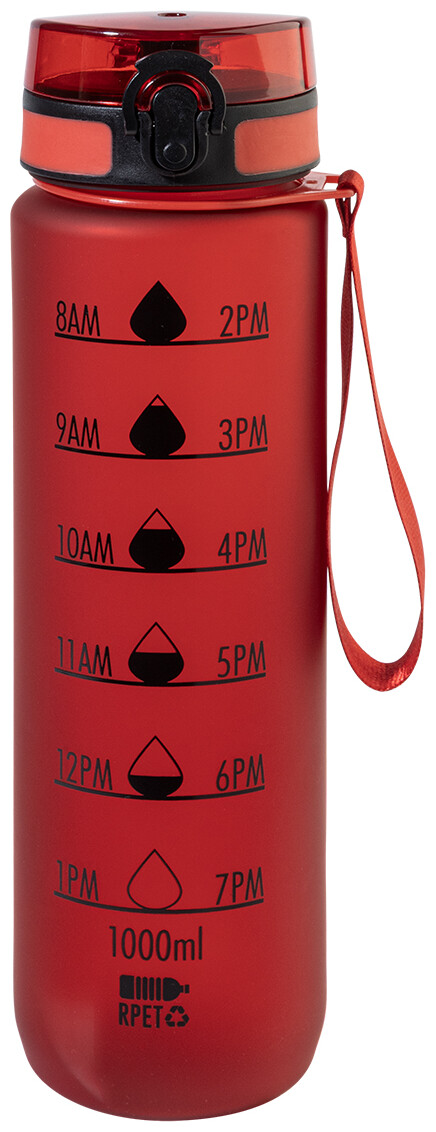Sportovní láhev z matného RPET s motivačním objemovým a časovým značením, s automaticky otevíratelným odklápěcím víčkem s bezpečnostním zámkem a poutkem na nošení. 1000 ml. Bez BPA. Nevhodné pro sycené nápoje.