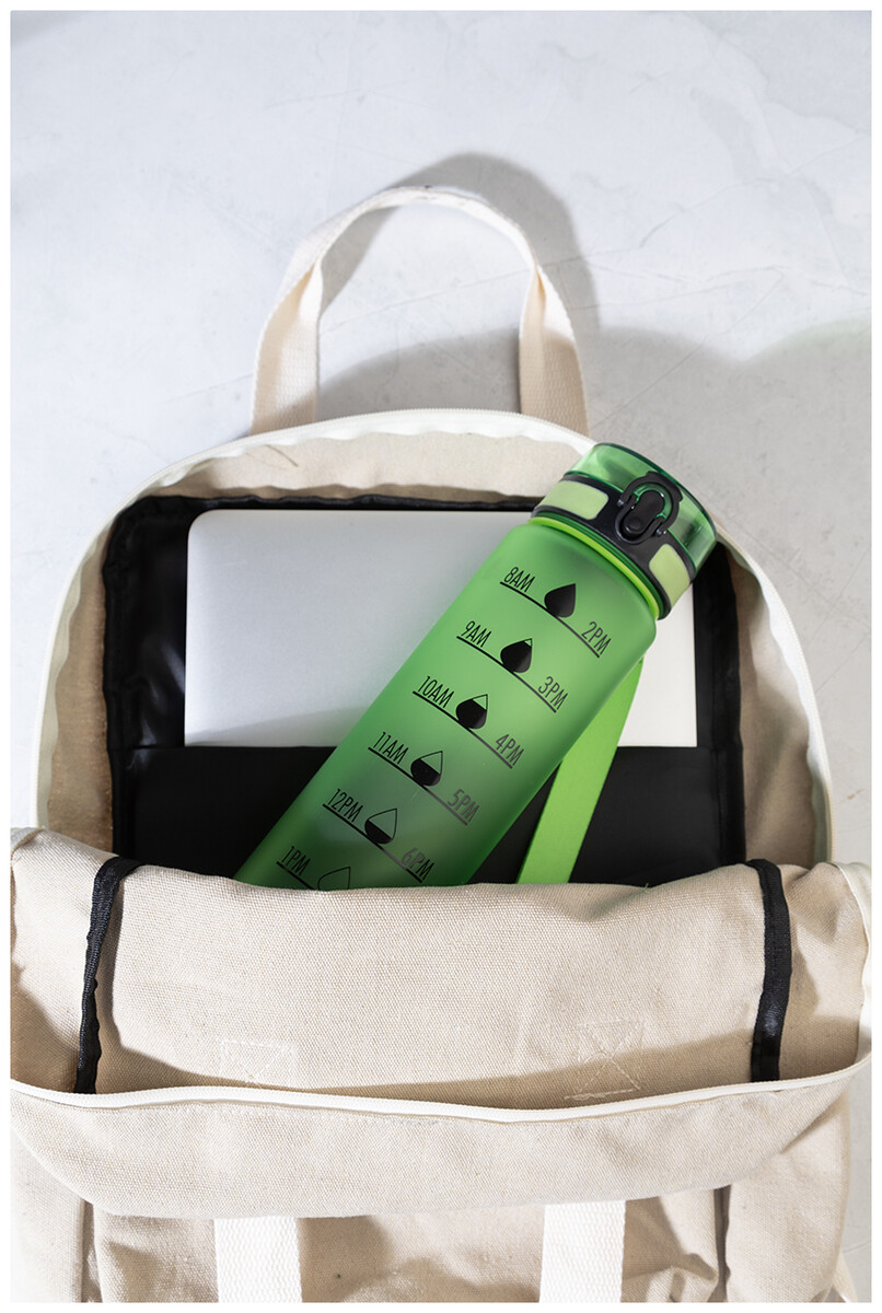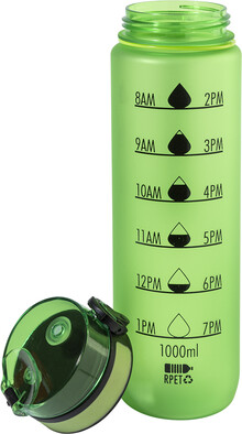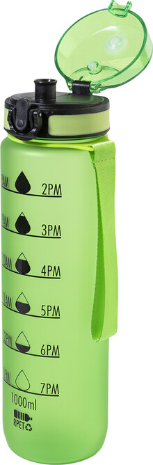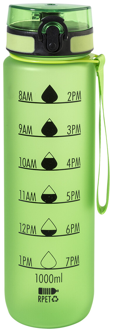 Sportovní láhev z matného RPET s motivačním objemovým a časovým značením, s automaticky otevíratelným odklápěcím víčkem s bezpečnostním zámkem a poutkem na nošení. 1000 ml. Bez BPA. Nevhodné pro sycené nápoje.