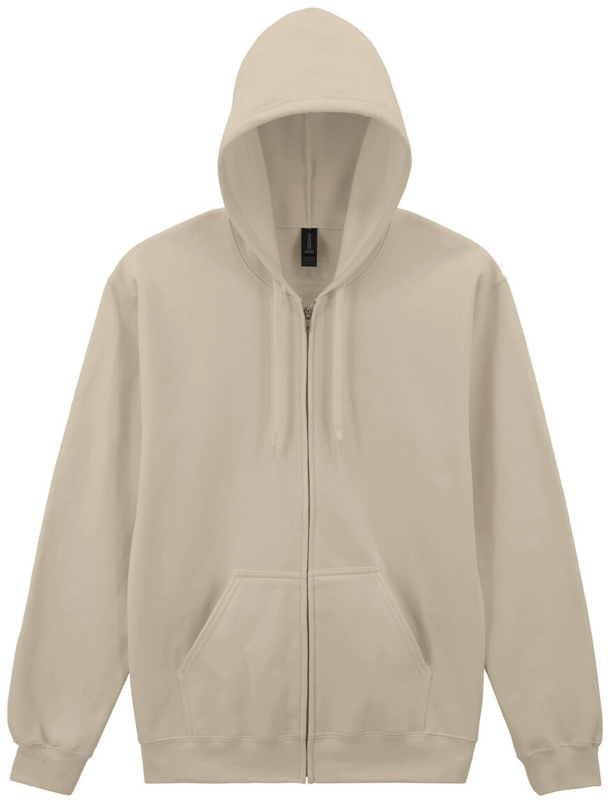 Mikina s kapucí na zip z 80% bavlny a 20% polyesteru s předními kapsami. 285 g/m2 (bílá 278 g/m2). Značka Gildan.