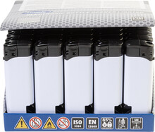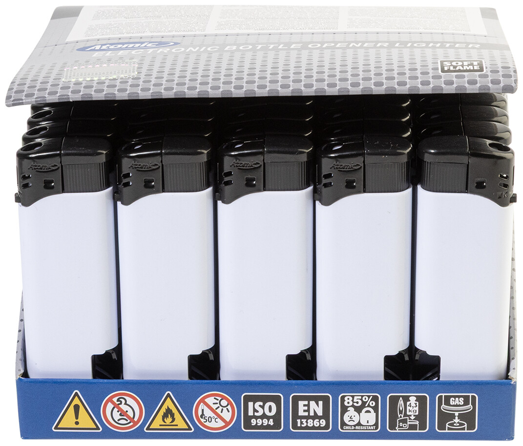 Plnitelný plastový piezoelektrický zapalovač s otvírákem. Dětská pojistka. Dodává se s přibližně 80% hladinou plynu. K dispozici pouze v plném exportním kartonovém množství (násobky 500 kusů)!