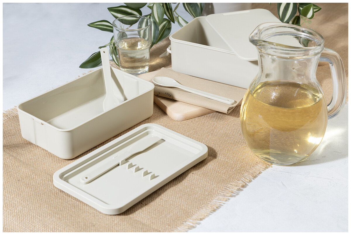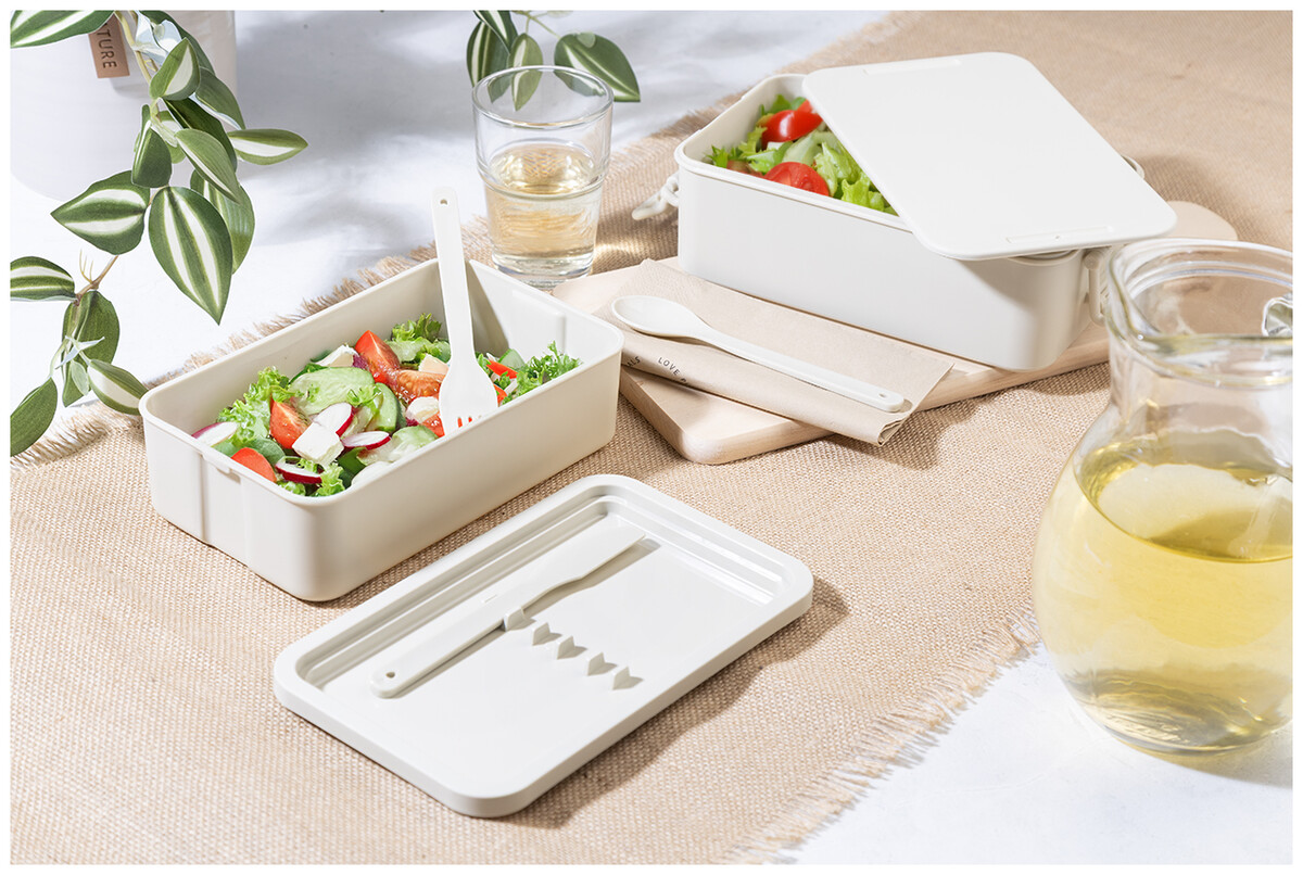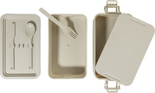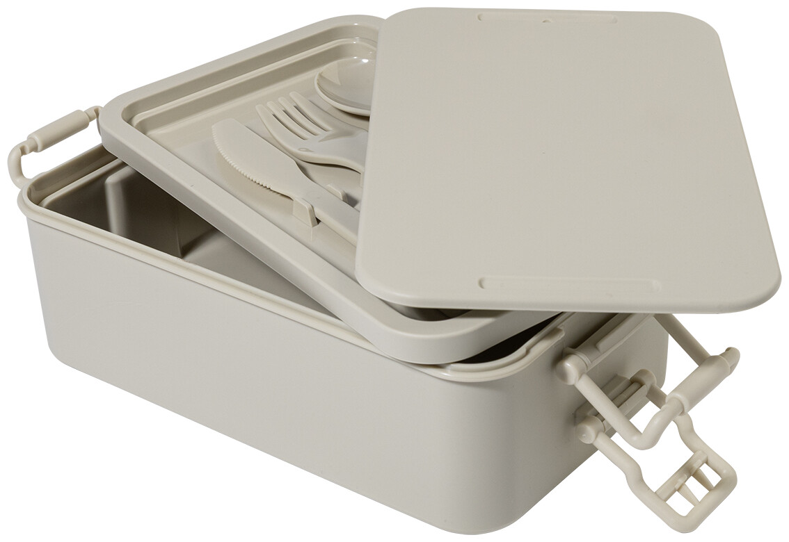 Box na jídlo z PP plastu se sadou příborů (vidlička, lžíce a nůž), zapínáním na přezku a 2 přihrádkami (1000 ml a 800 ml). Stohovatelný design pro kompaktní skladování.