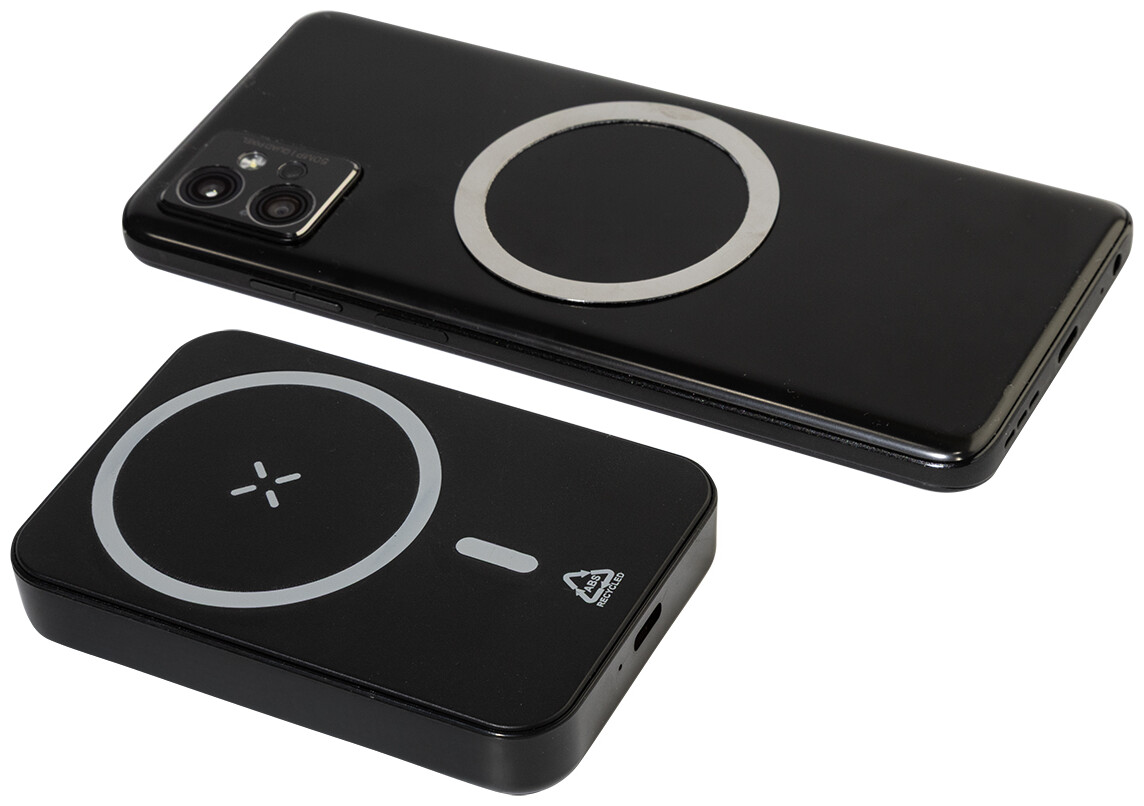 Power banka z recyklovaného ABS s baterií 5000 mAh a vestavěnou magnetickou bezdrátovou rychlonabíječkou (15 W). S USB-C vstupem a nabíjecím portem. Včetně samolepicího kovového kroužku pro použití magnetické funkce na jakémkoli bezdrátově nabíjecím zařízení. Kompatibilní s iPhone® 12 nebo novějším. Včetně nabíjecího kabelu USB.