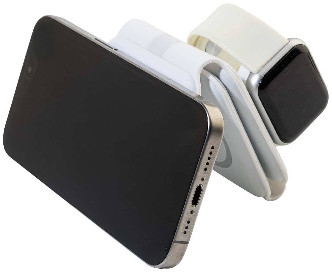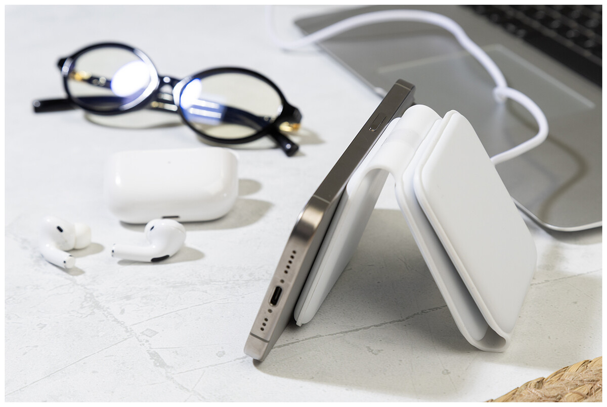 Skládací držák na mobilní telefon a bezdrátová nabíječka z recyklovaného ABS plastu. S magnetickou bezdrátovou rychlonabíječkou (15 W), bezdrátovou nabíječkou (5 W) pro sluchátka a bezdrátovou nabíječkou (2,5 W) pro chytré hodinky (pouze Apple®). Včetně samolepicího kovového kroužku pro telefony bez magnetického povrchu. Včetně USB nabíjecího kabelu.
