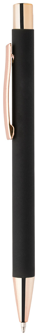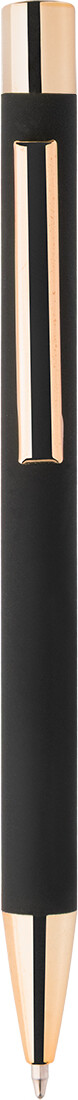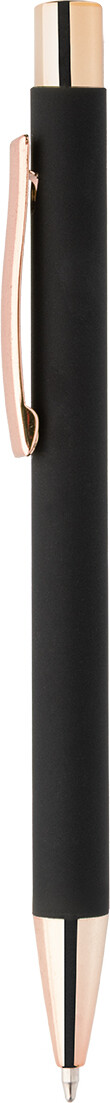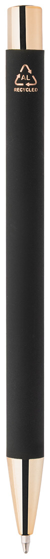 Kuličkové pero z recyklovaného hliníku s černým pogumovaným tělem a barevnými lesklými kovovými částmi. Se speciálním povrchem pro zrcadlové gravírování, které ladí s kovovými částmi. S modrou náplní.