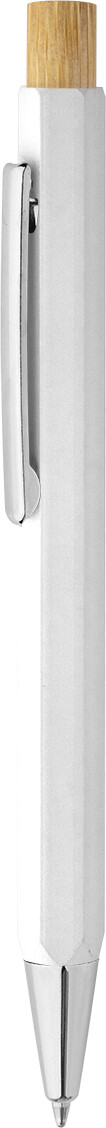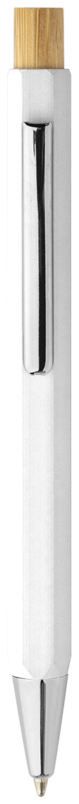 Šestihranné kuličkové pero z recyklovaného hliníku s bambusovým tlačítkem a chromovanými částmi. S modrou náplní.