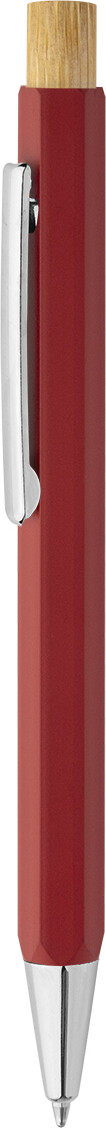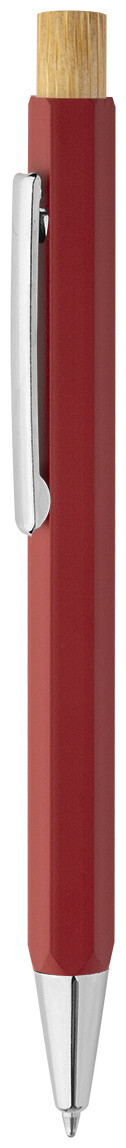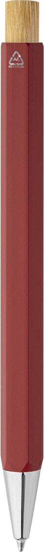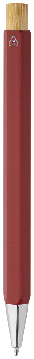 Šestihranné kuličkové pero z recyklovaného hliníku s bambusovým tlačítkem a chromovanými částmi. S modrou náplní.