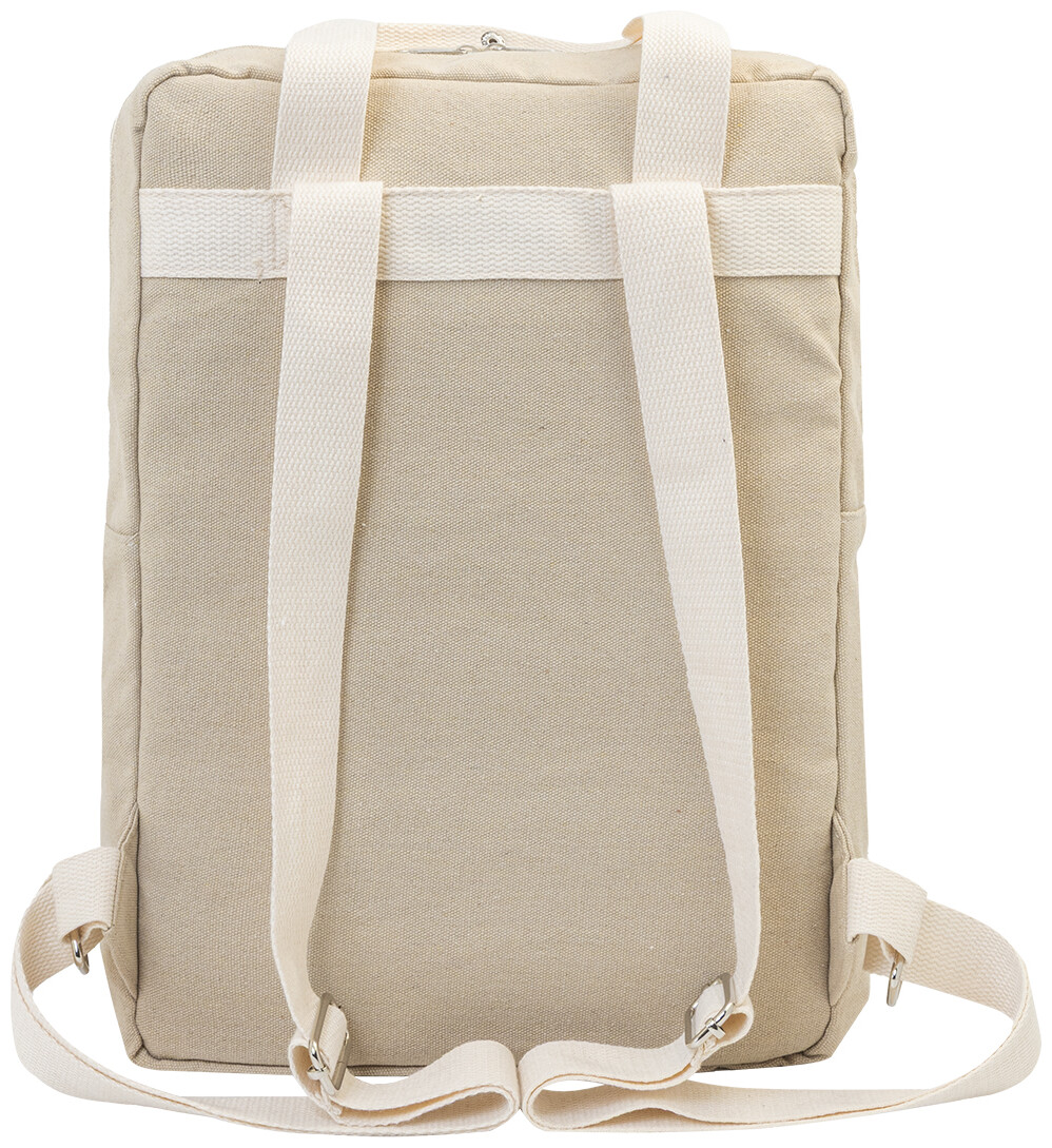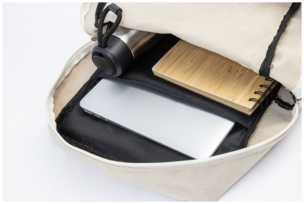 Batoh z recyklovaného plátna s hlavní přihrádkou na zip, polstrovanou přihrádkou na notebook (13") a přední kapsou na suchý zip. 70 % recyklované bavlny a 30 % RPET polyesteru. S výraznou etiketou o recyklované bavlně.