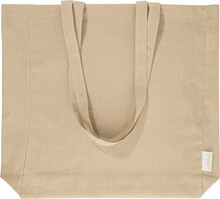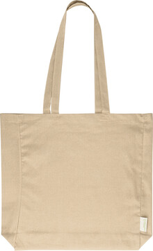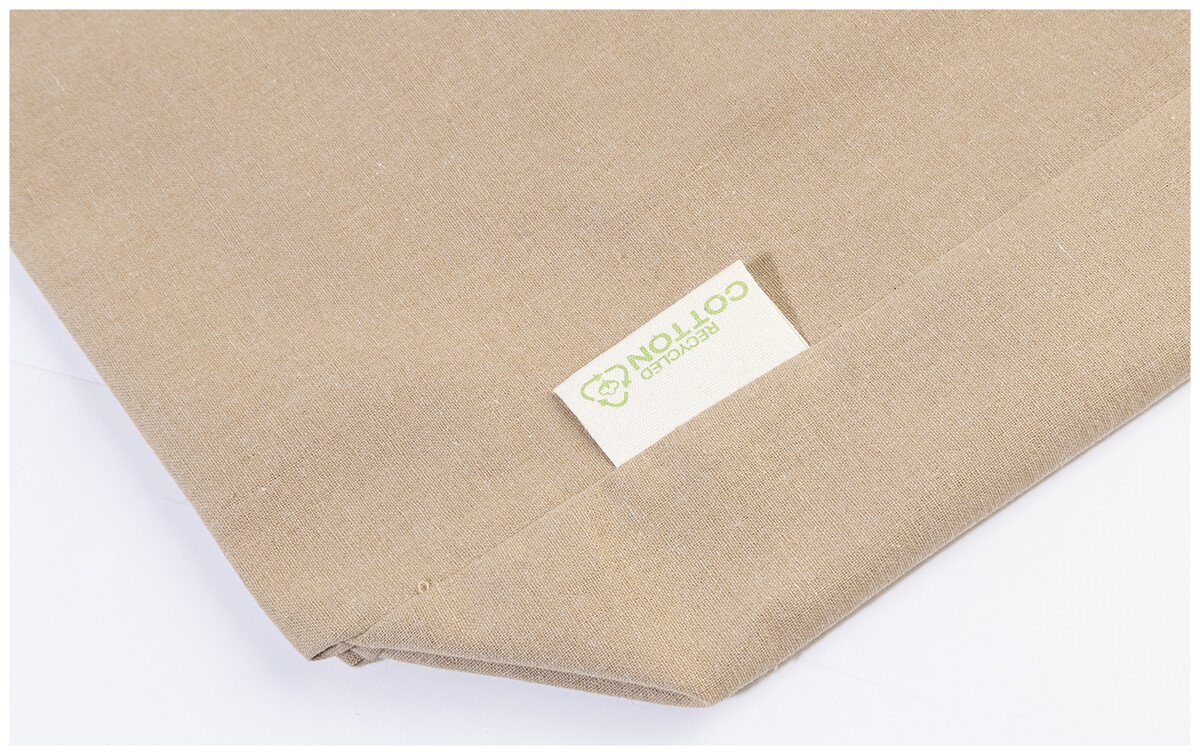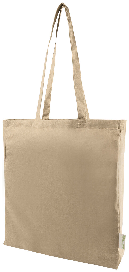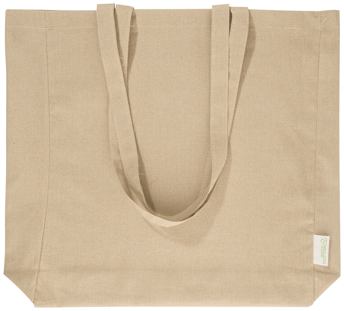 Nákupní taška s klínkem a dlouhými uchy ze 70 % recyklované bavlny a 30 % RPET polyesteru, 140 g/m2. S výraznou etiketou o recyklované bavlně.