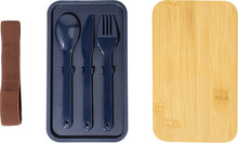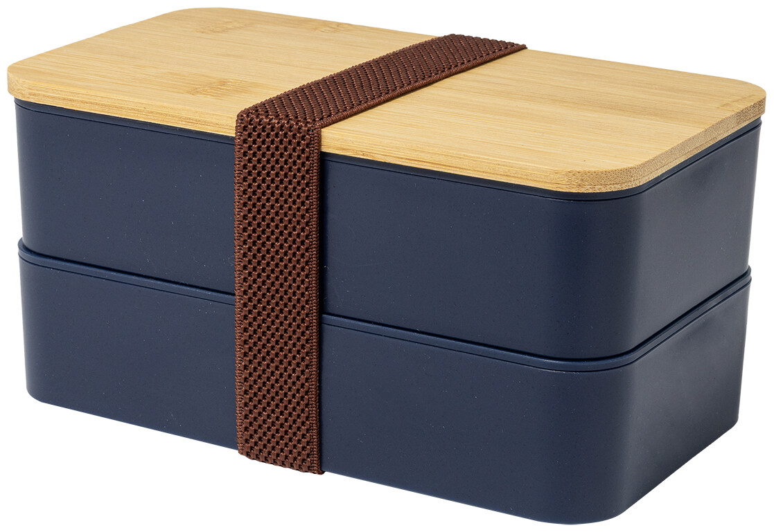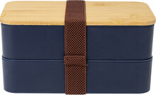 Box na jídlo z PP plastu se sadou příborů (vidlička, lžíce a nůž), bambusovým víkem a elastickým popruhem. Se 2 přihrádkami o objemu 700 ml.
